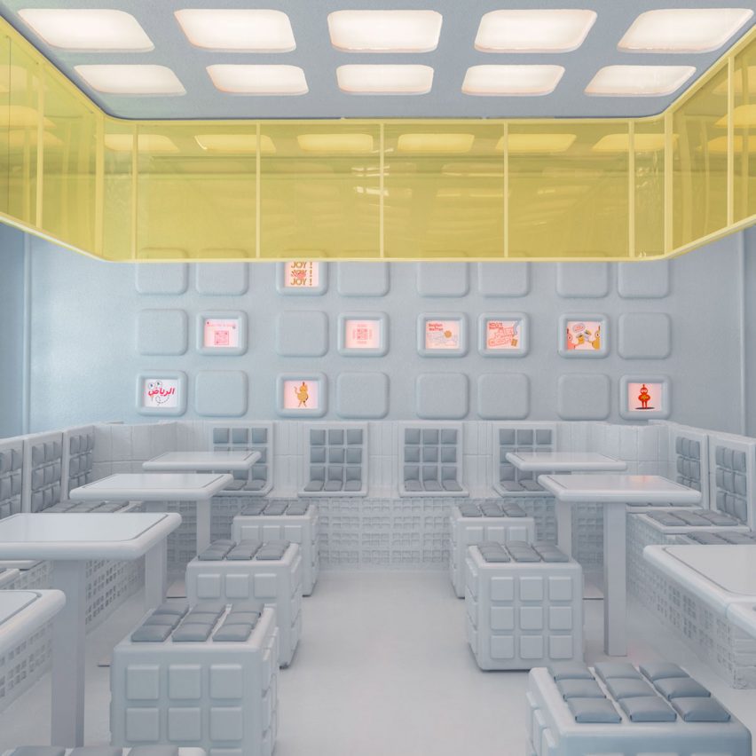Spanish studio Masquespacio designed the interior of this restaurant in Riyadh, Saudi Arabia, referencing the appearance of waffles through grid patterns applied throughout the furniture and décor.
