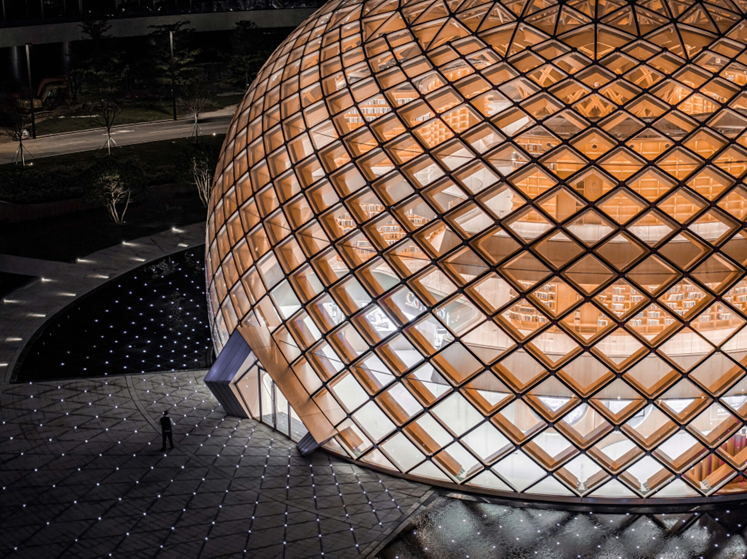 The architectural identity of the building is defined by two independent yet seamlessly integrated structural systems: a spherical laminated timber (glulam) lattice shell and a primary steel structural framework. This dual-layered strategy delivers high performance in both aesthetic and engineering terms, while simultaneously creating a rich, multi-layered spatial experience.