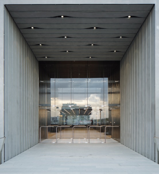 The tower’s innovative cladding system maximizes year-round operational efficiency by using horizontal exterior façade fins with variable profiles. As the façade’s slender, curved profiles wrap around the tower, they shift direction and create a texture that changes depending on the viewer’s perspective. The structure’s curtain wall incorporates interior wooden shading elements that allow users to individually control daylight within their workspaces. The result is a responsive and kinetic façade system that meets office needs, inspires the city’s new and expanding district, enhances the building’s architectural impact, and remains environmentally conscious. As one moves throughout the day and around the building, this innovative wall assembly creates a transformative effect that draws the observer in and evokes curiosity. The sculptural exterior fins form different patterns depending on the sun’s position and the pedestrian’s viewpoint. As the wooden shutters are opened and closed according to user needs, the tower itself appears either permeable or reflective, revealing the distribution of use and activity within.