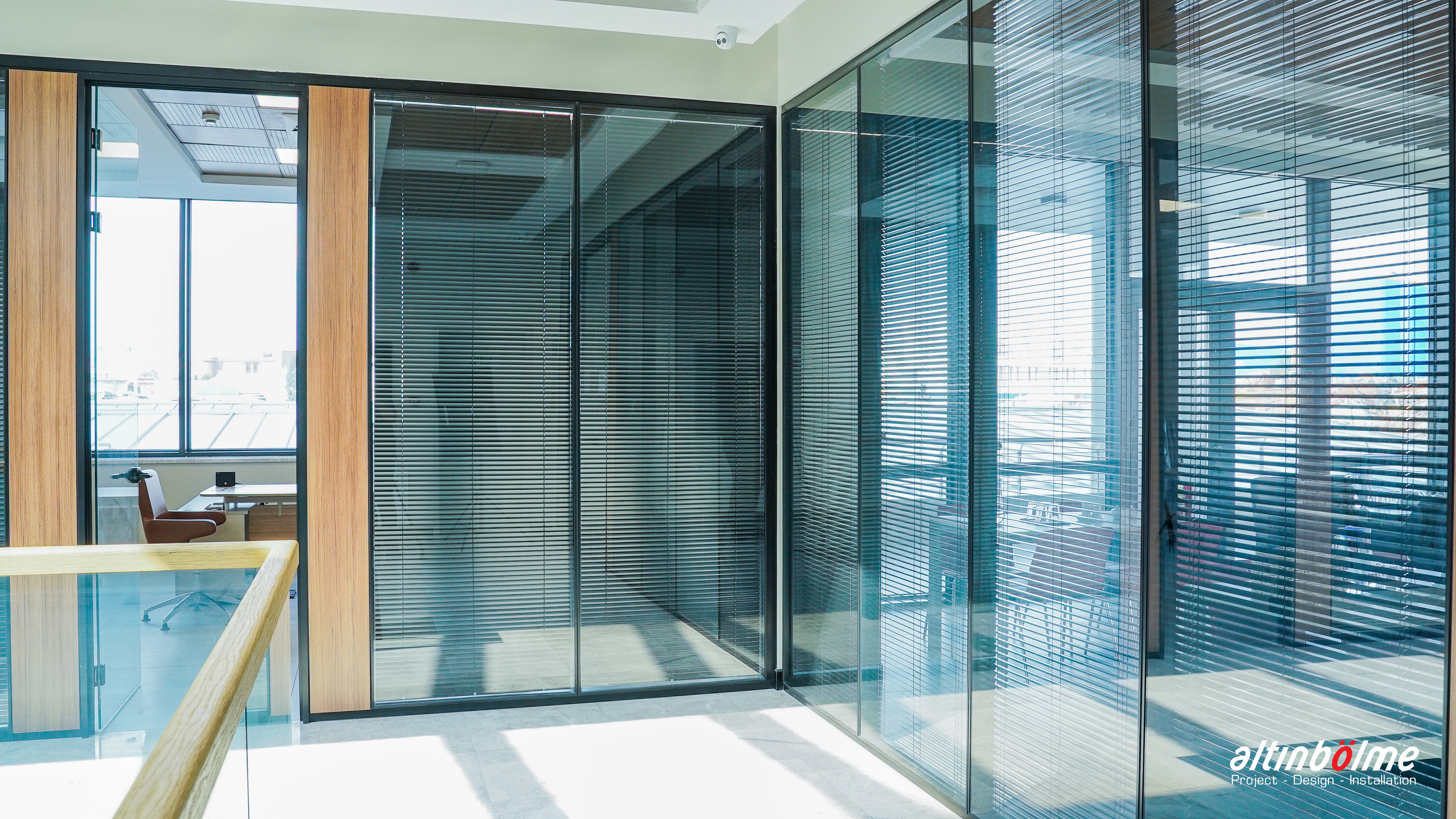 Alnoplan D100 is a 100 mm thick partition wall system with jointed construction, available in single or double glazing and offering high acoustic performance. Designed with aesthetics and transparency in mind, this system complements modern interiors with its minimalist structure. Manual or electrically operated blinds can be integrated within the double-glazed frame, providing user comfort and privacy. Minimization of glass profiles creates a more spacious and open perception, while the slim and elegant frame design delivers a refined appearance in office environments.