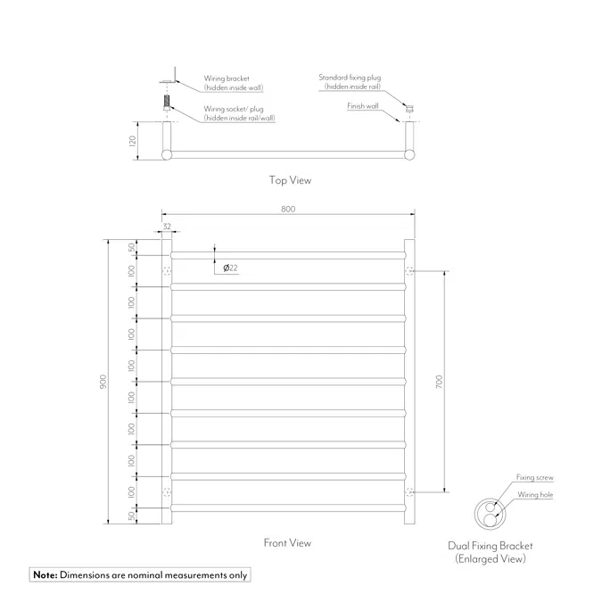 • Nine evenly spaced heated bars for maximum towel coverage