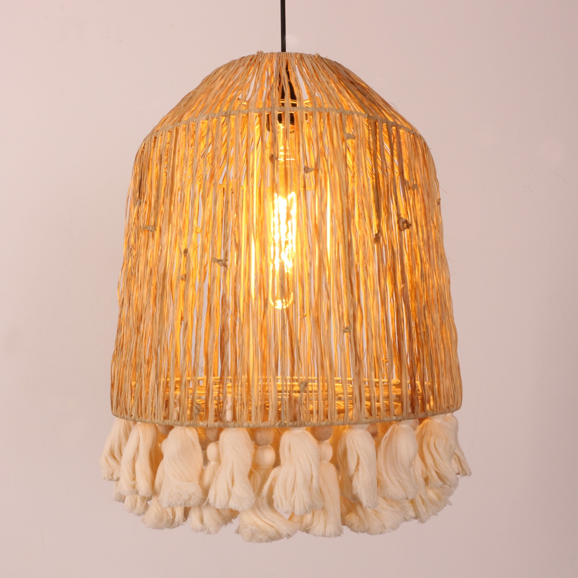 Our manufactured product features a raffia-woven separator at the bottom to distribute light evenly. Our product is handcrafted from natural raffia material on static-dyed wire.