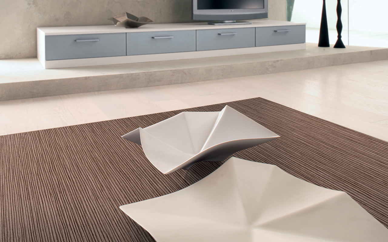 The movement of light across the vertical grooves creates variable shadow effects, transforming static areas into dynamic design elements. Available in textured wood veneer or melamine options, this series is a sophisticated cladding solution for projects seeking a characteristic touch, particularly on table tops and furniture surfaces.