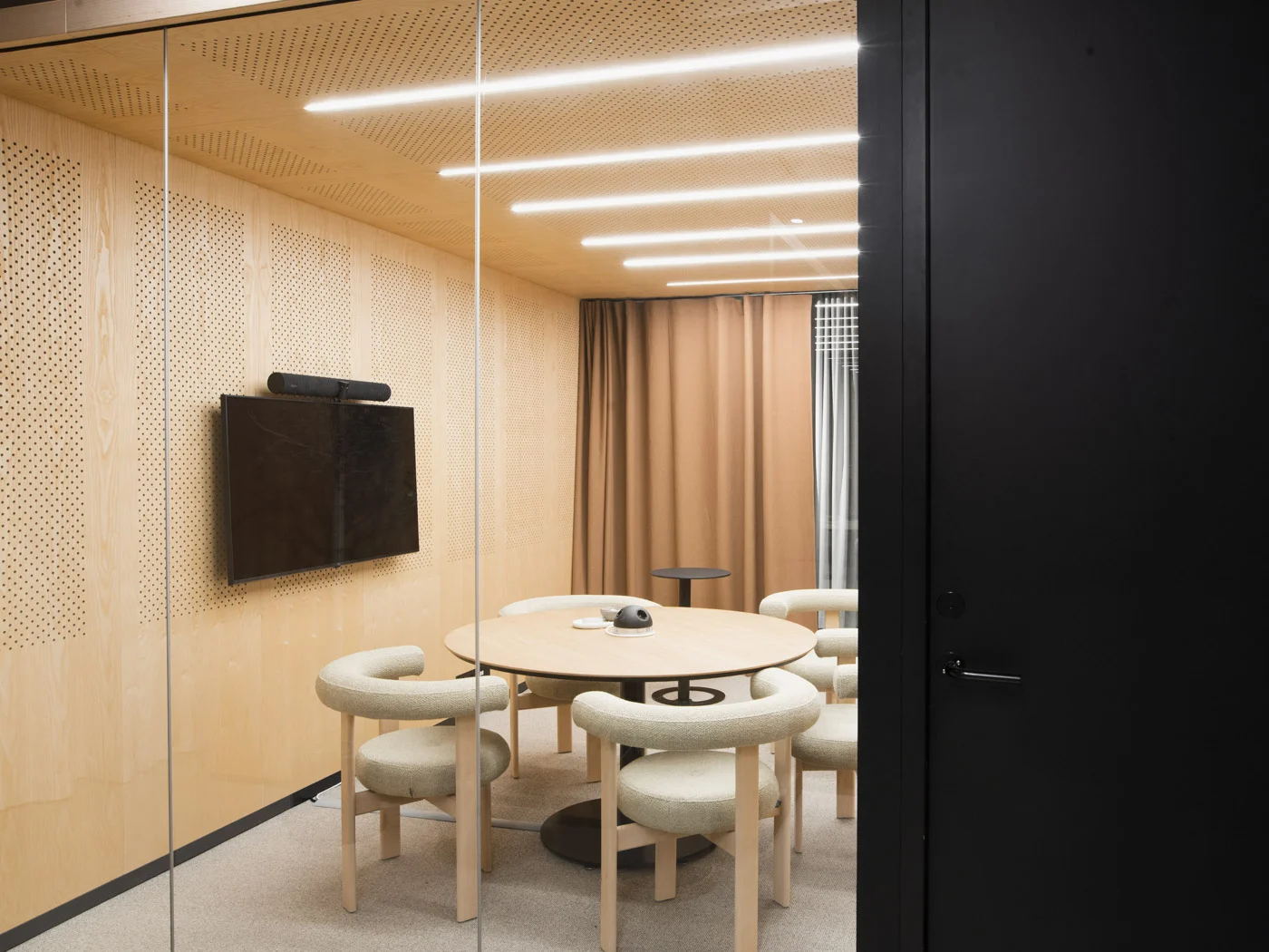 Lohko Flex is a large modular space solution. Its product range includes carefully designed spaces of up to 28 square meters. Flex can be used as a collaborative workspace, meeting booth, conference room, or waiting area. Its design with perforated walls allows for various configurations and the installation of necessary accessories.