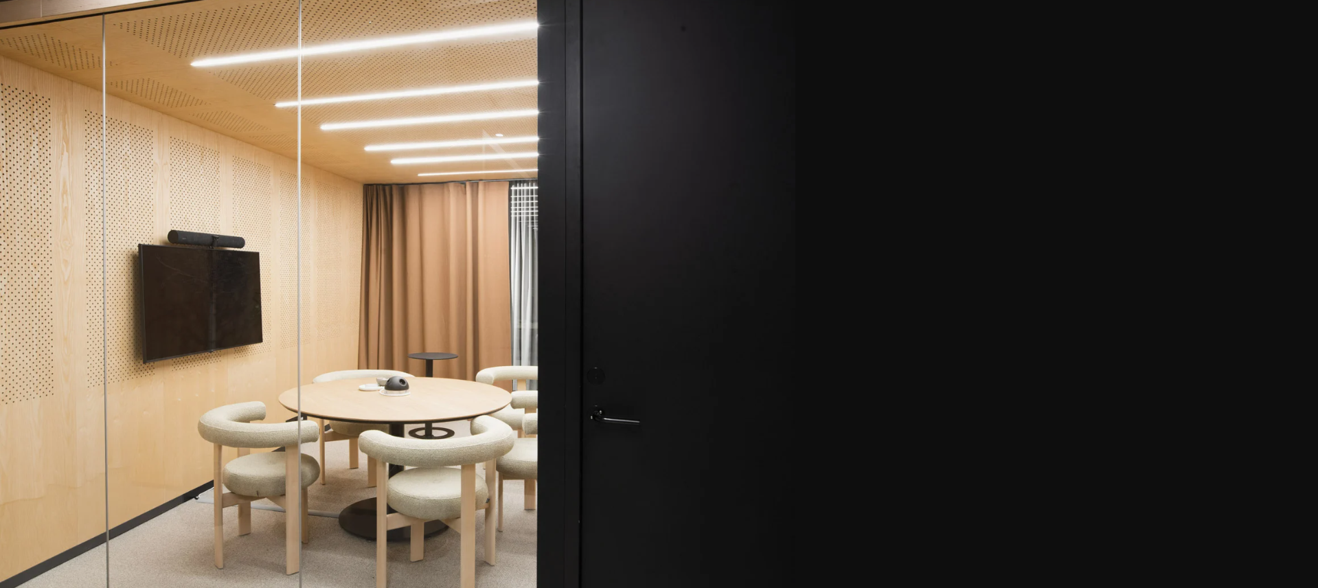 Lohko Flex is a large modular space solution. The product line encompasses thoughtfully designed spaces up to 28 square meters. Flex works well as a co-working space, meeting booth, conference room or waiting room. The design with perforated walls allows for various layouts and attachment of required accessories.