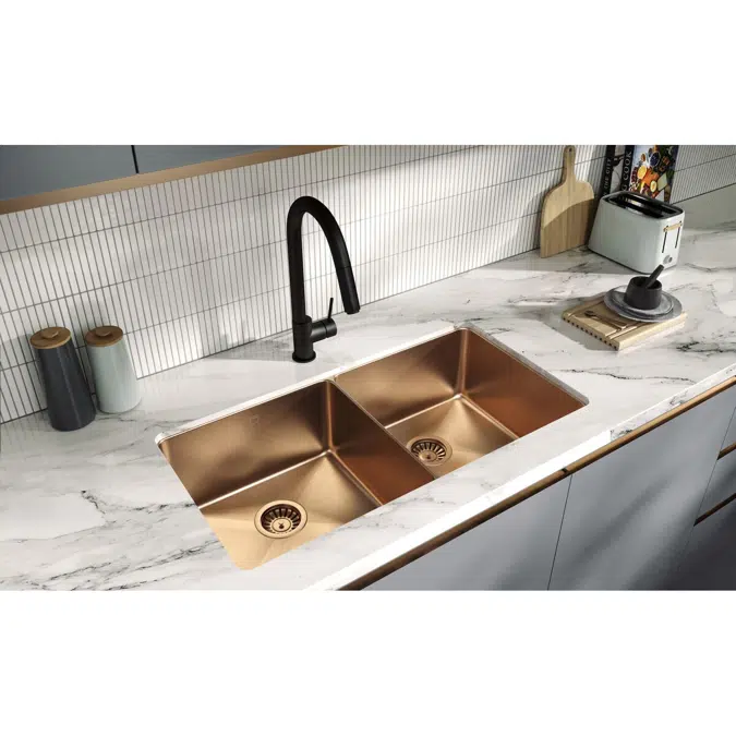 The Memo Zenna Double Bowl Sink by Reece is a premium kitchen sink engineered for durability and style. Crafted from high-quality stainless steel with an innovative nanoplated bronze finish, this double bowl design combines functionality with a sophisticated appearance, making it an excellent addition to any modern kitchen.