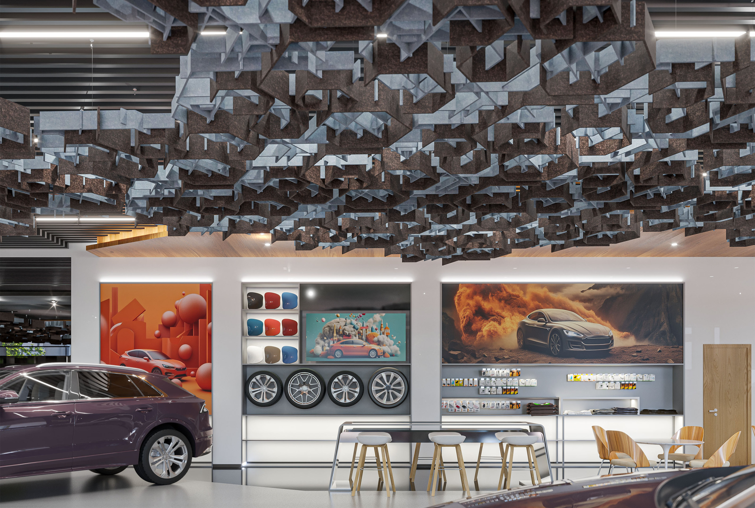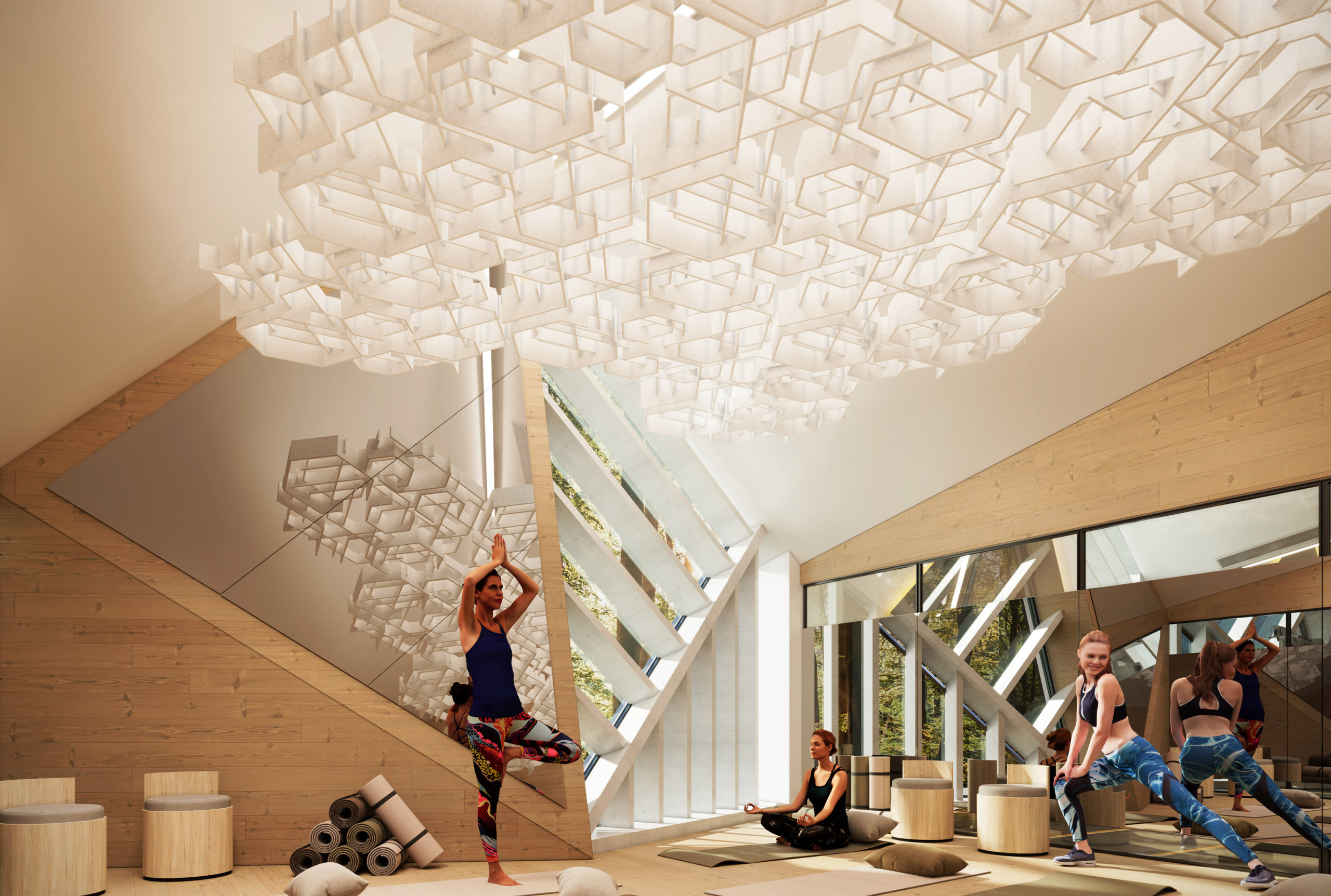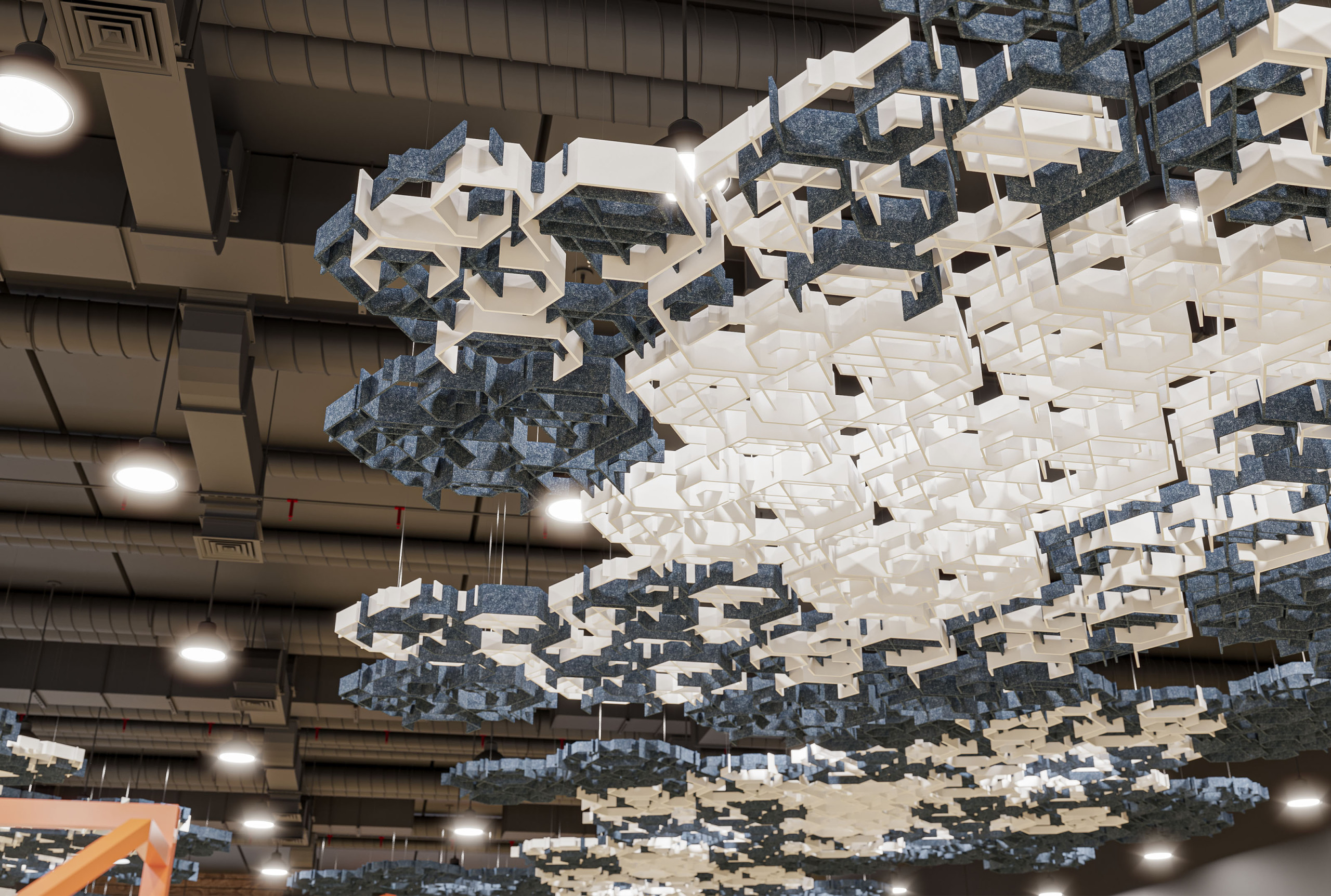 Introducing NOWN's SoftGrid® FORGE, the perfect solution for enhancing your space's acoustics while adding a touch of elegance. These innovative ceiling clouds are designed to seamlessly integrate with other NOWN hexagonal systems, such as SoftGrid® Deca and SoundStar®, creating a cohesive look that not only absorbs sound but elevates your interior aesthetics.
