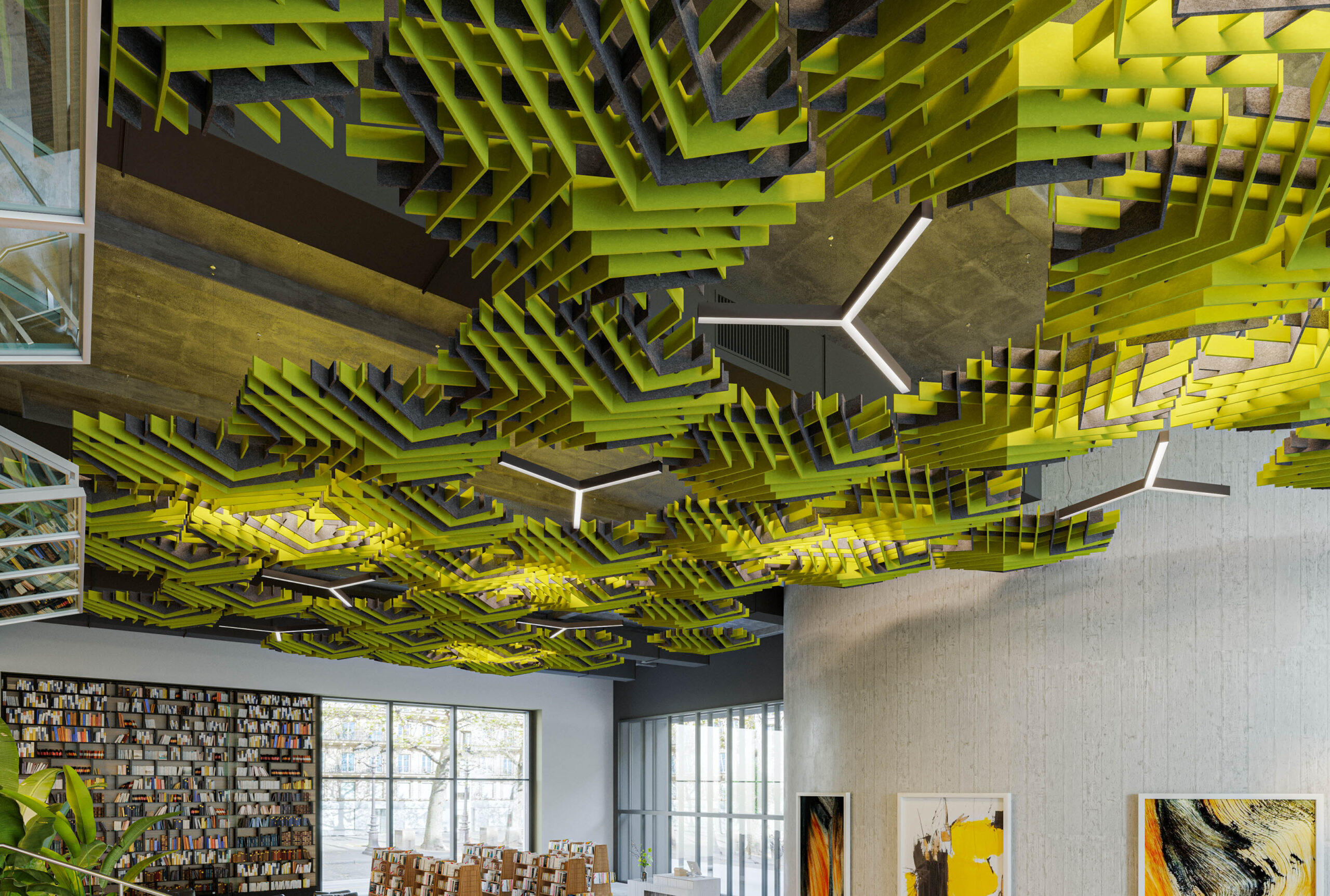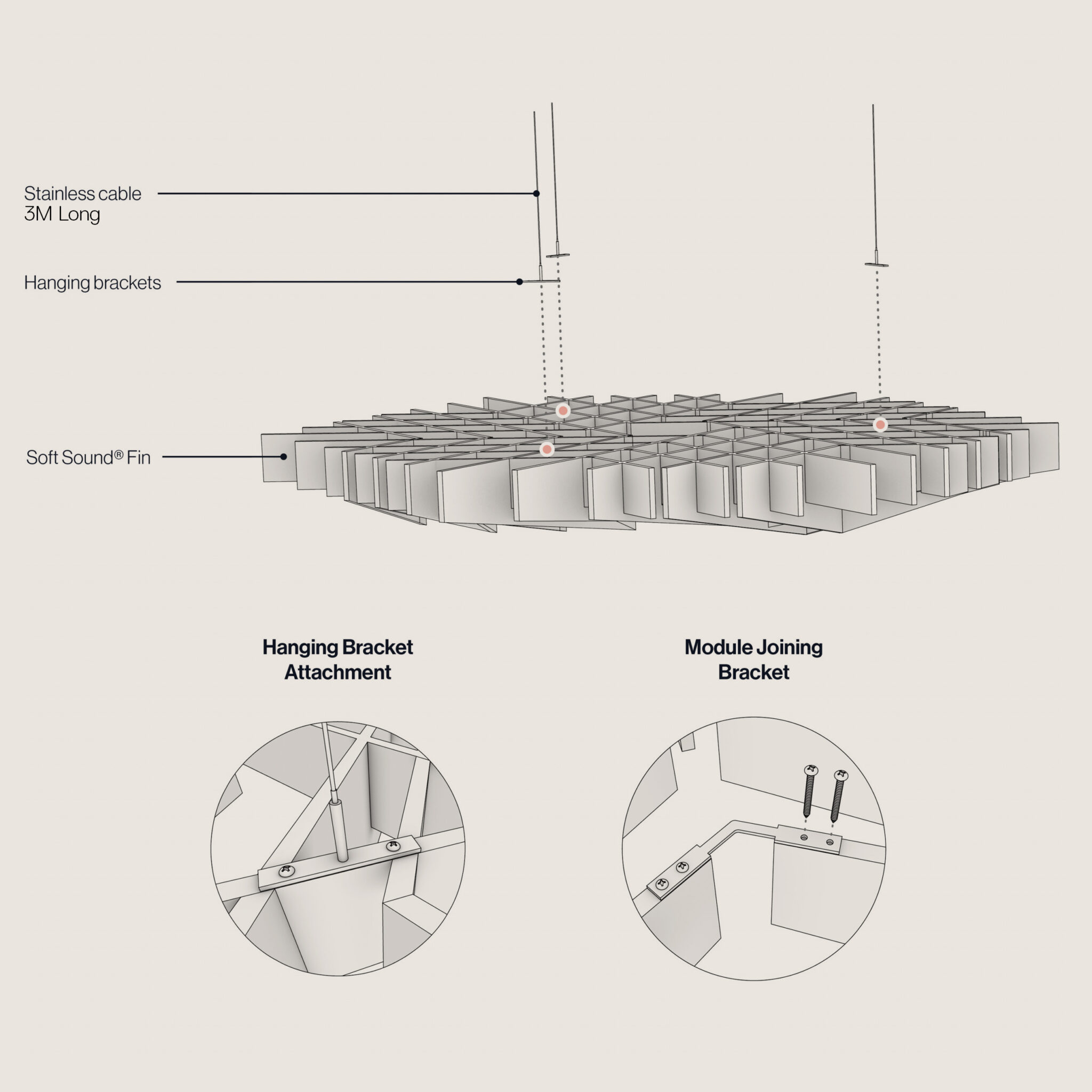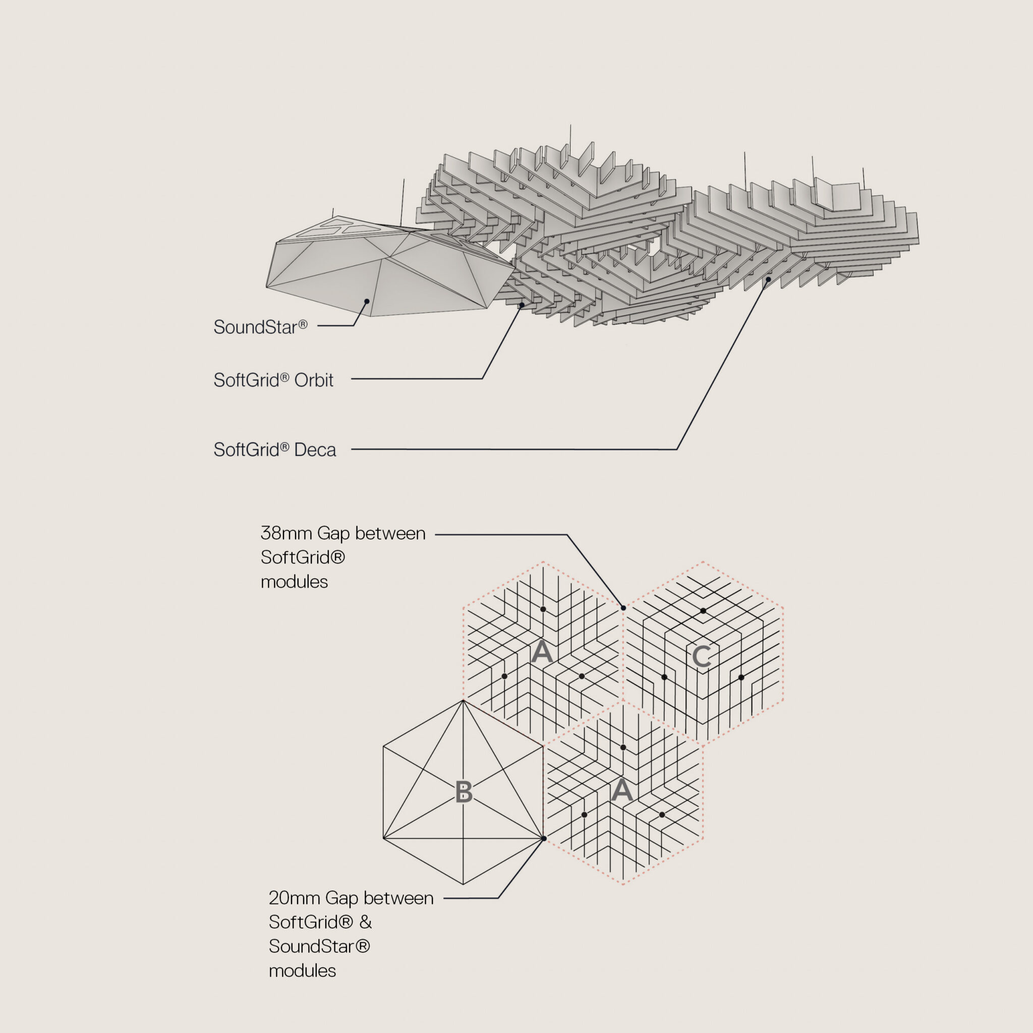 Whether you choose to create an intricate centerpiece or a seamless canopy of hexagons, the modular design of SoftGrid® ORBIT allows for effortless connectivity and customization. Elevate your interiors while achieving optimal sound control and aesthetics, making every room not only beautiful but also acoustically comfortable.