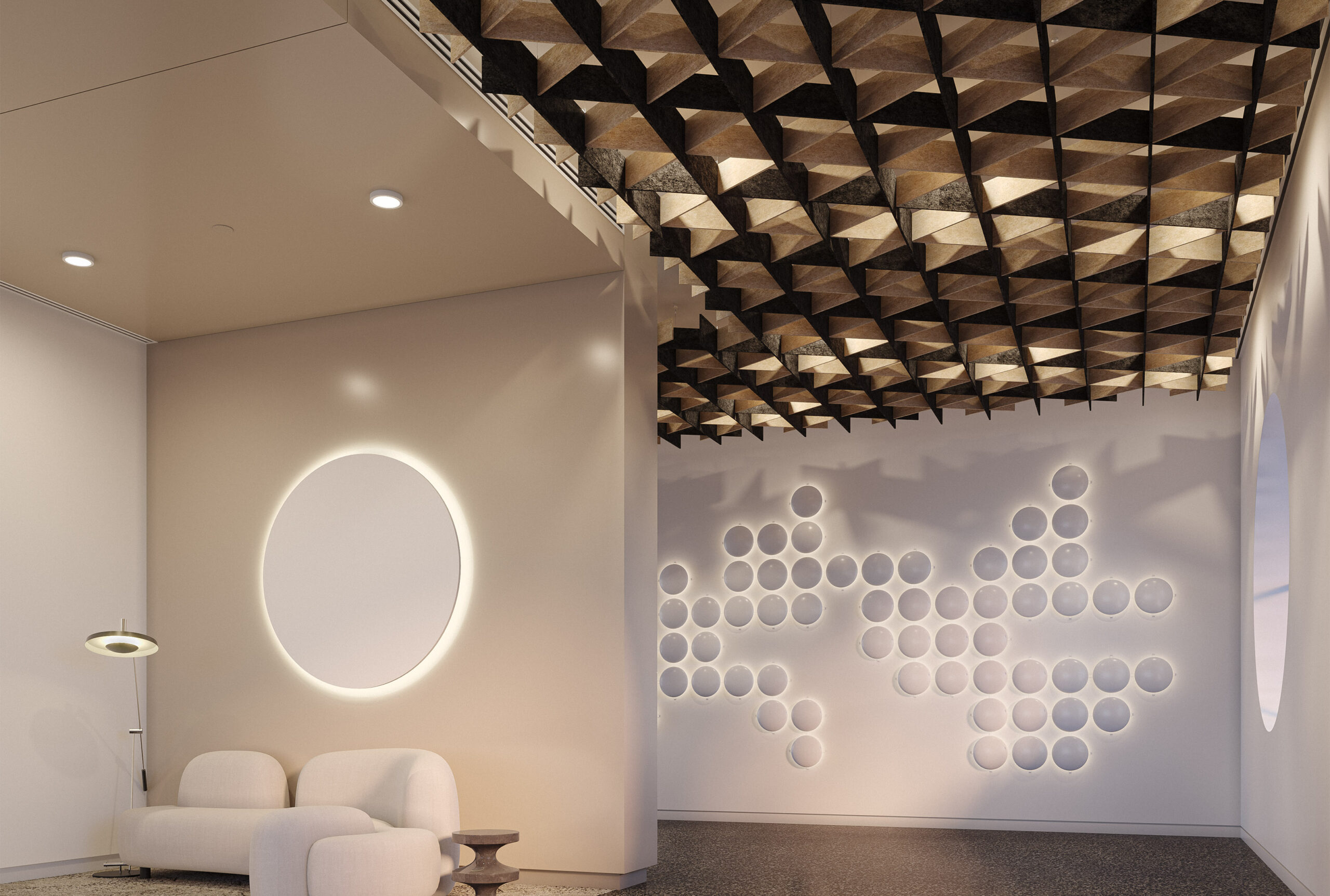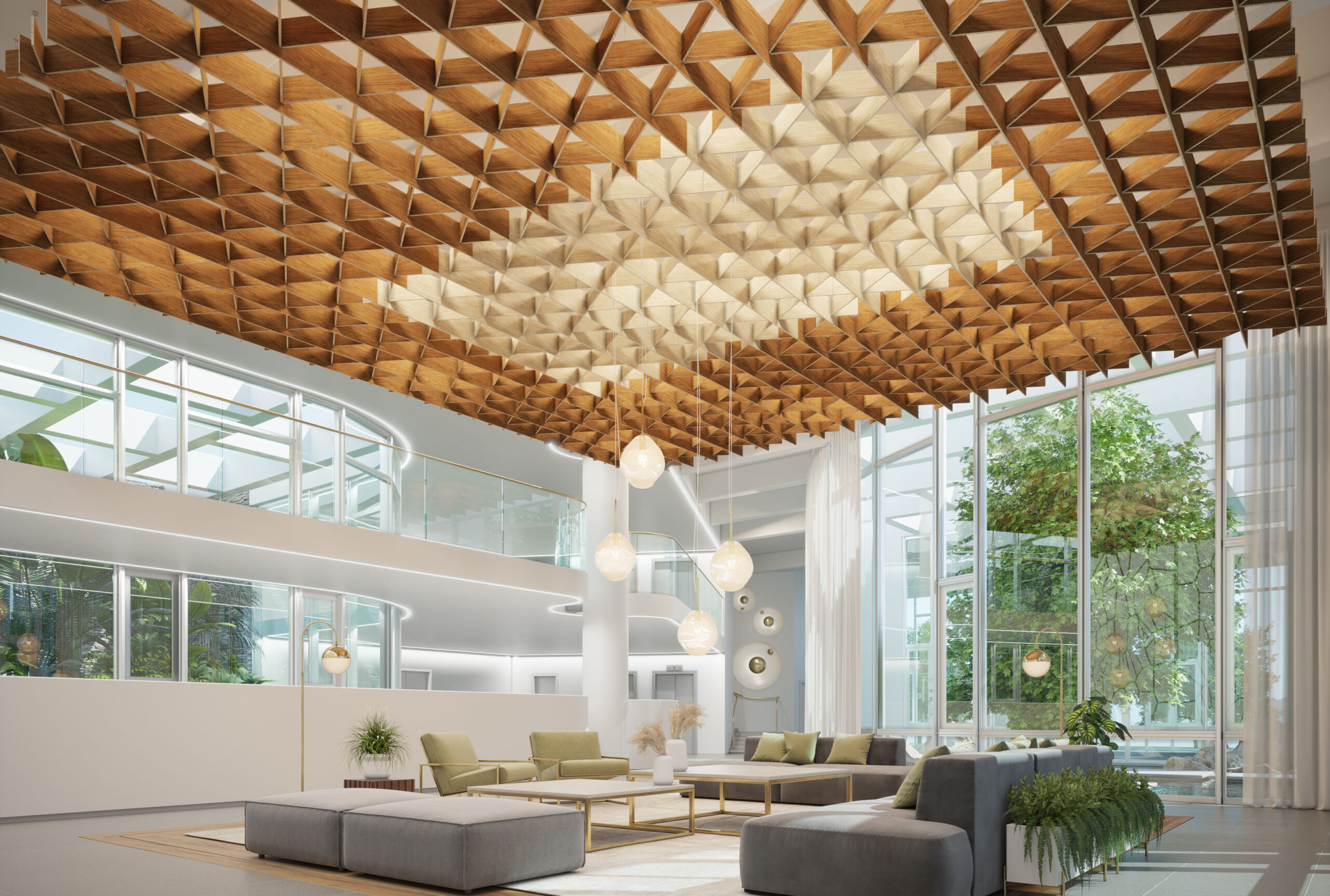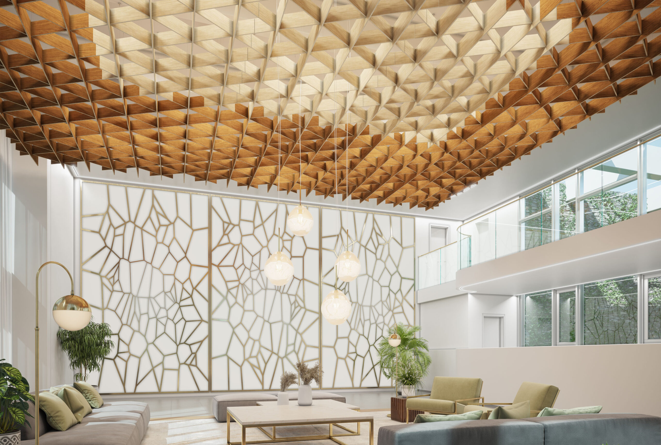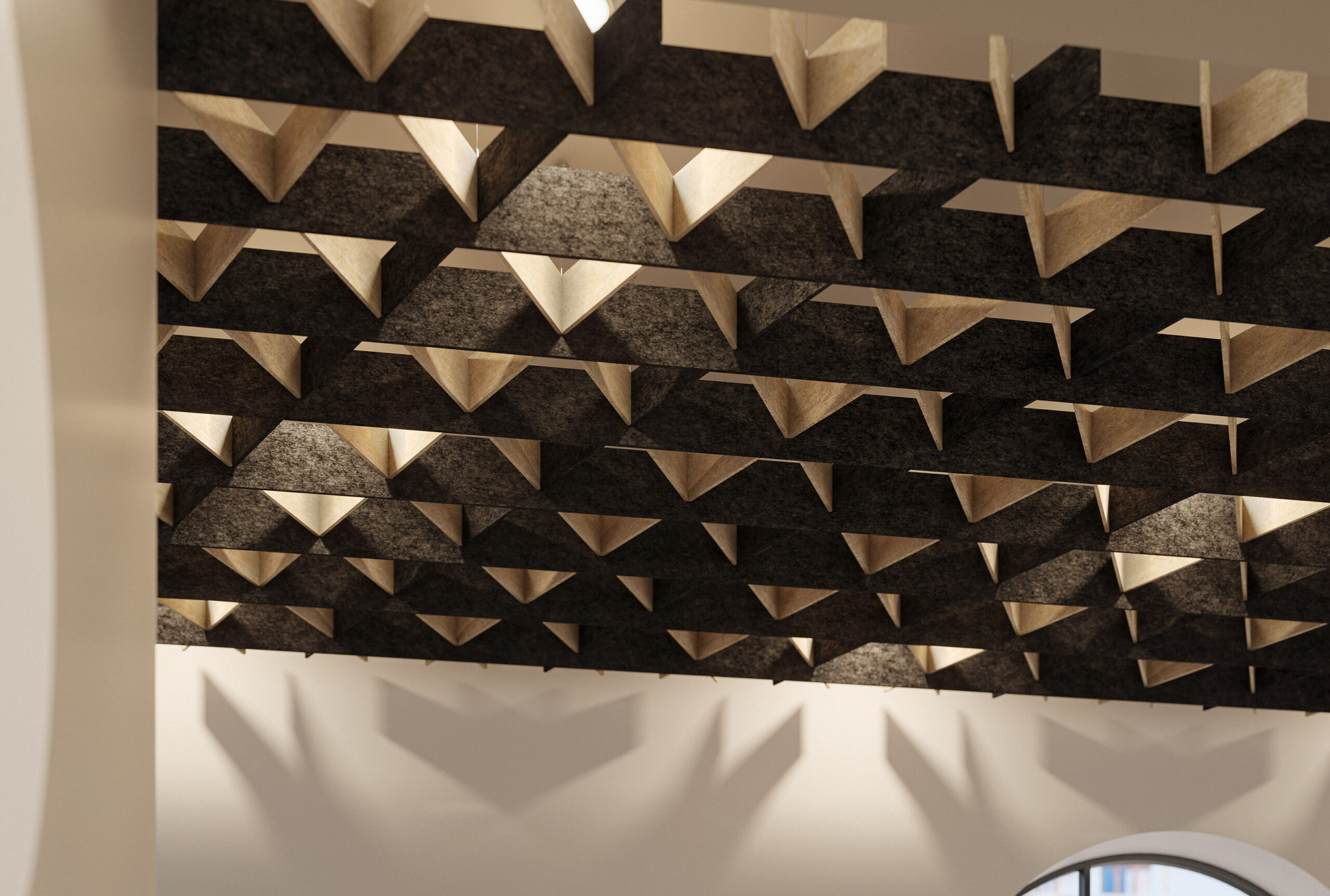 Transform your space with NOWN's SoftGrid® TRELLA, an innovative acoustic solution that combines style and functionality. The crisscrossing linear baffles crafted from our proprietary Asoft™ acoustic material create a stunning lattice-like structure that not only enhances your decor but also promotes auditory serenity throughout the room. By connecting multiple Trella modules, you can stretch a harmonious trellis across your ceiling, enveloping your environment in tranquil sound absorption.