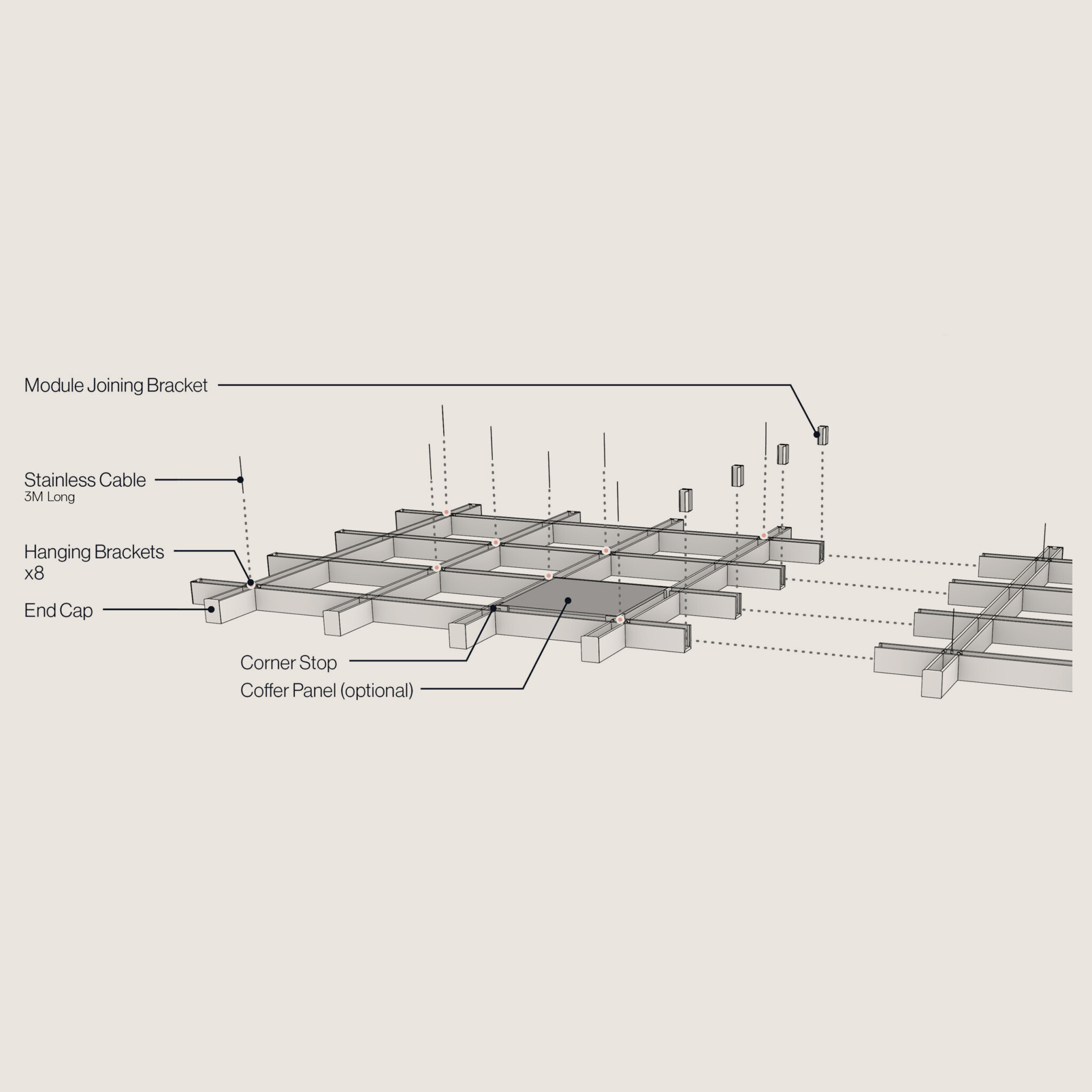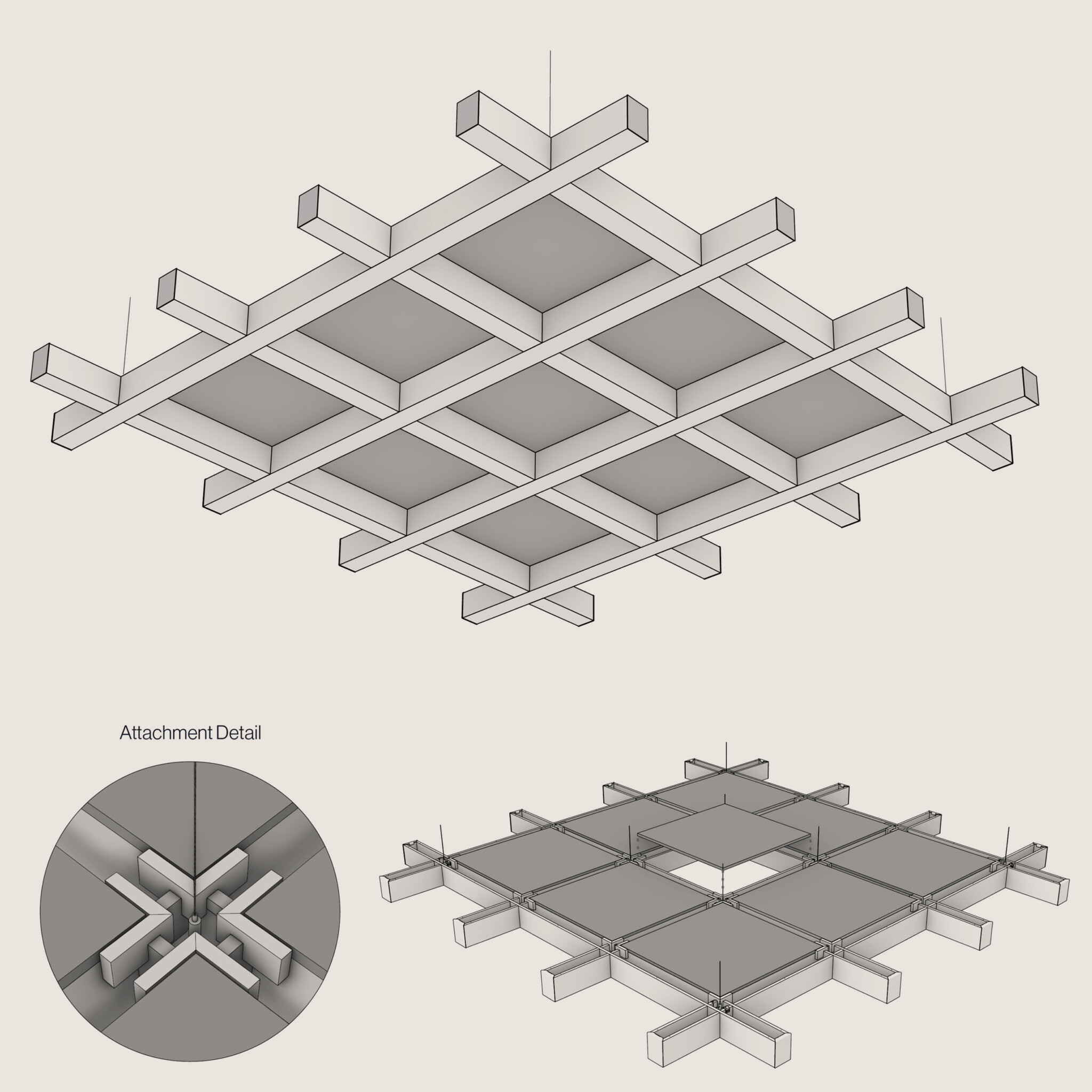 Transform your space with NOWN's SoftSpan® 24, an innovative ceiling baffle system designed to emulate the elegance of coffered ceilings or timber trellises without the cumbersome weight. This stylish solution not only enhances the visual appeal of any environment but also improves acoustics, significantly reducing unwanted noise for a more serene atmosphere.