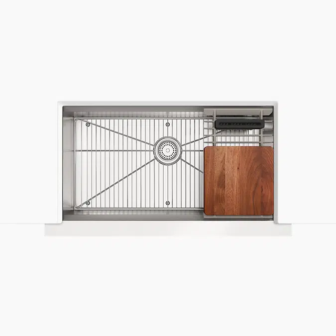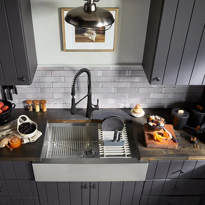 This sink combines farmhouse style with innovative workstation features, providing functionality and elegance for an efficient kitchen workspace.