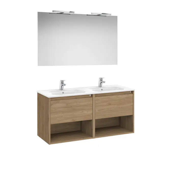 Pack - base unit with two drawers, bottom shelves, double basin, mirror and LED spotlight. Embrace a minimalist aesthetic with this contemporary furniture range, characterised by its simple and elegant design. Featuring a single drawer and an open shelf, Tenor offers versatility in a range of sizes and finishes.