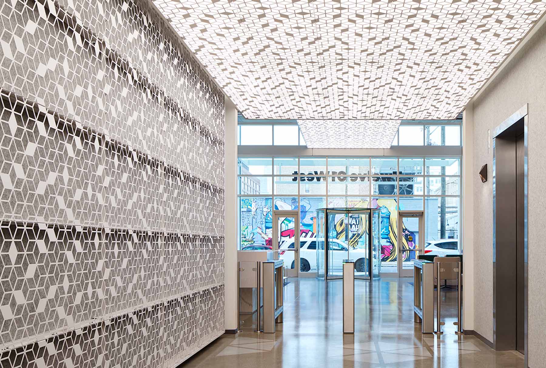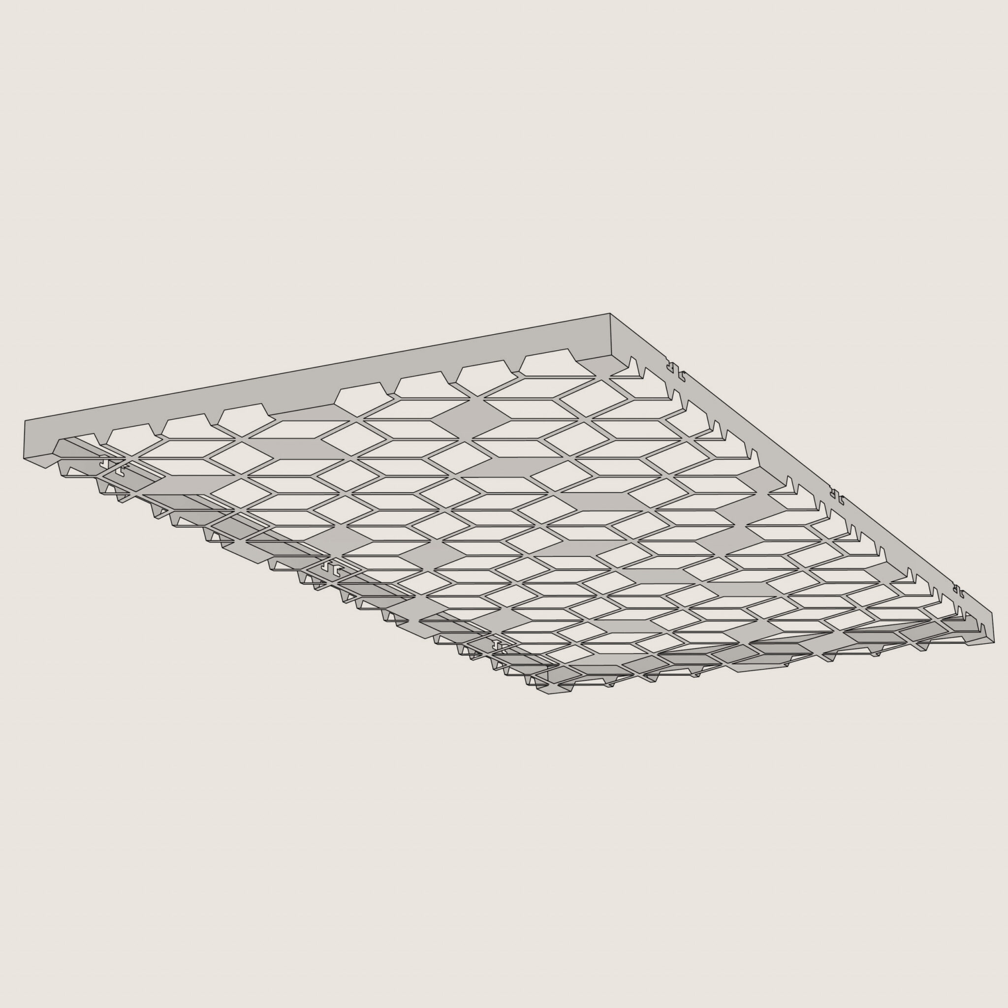 Introducing NOWN's 'Vapor® CORA' ceiling and wall panels, where innovation meets artistry. Crafted with a stunning diamond grid pattern, these aluminum torsion spring panels break the mold by incorporating scattered solid forms, transforming a classic aesthetic into a modern masterpiece that complements any space.