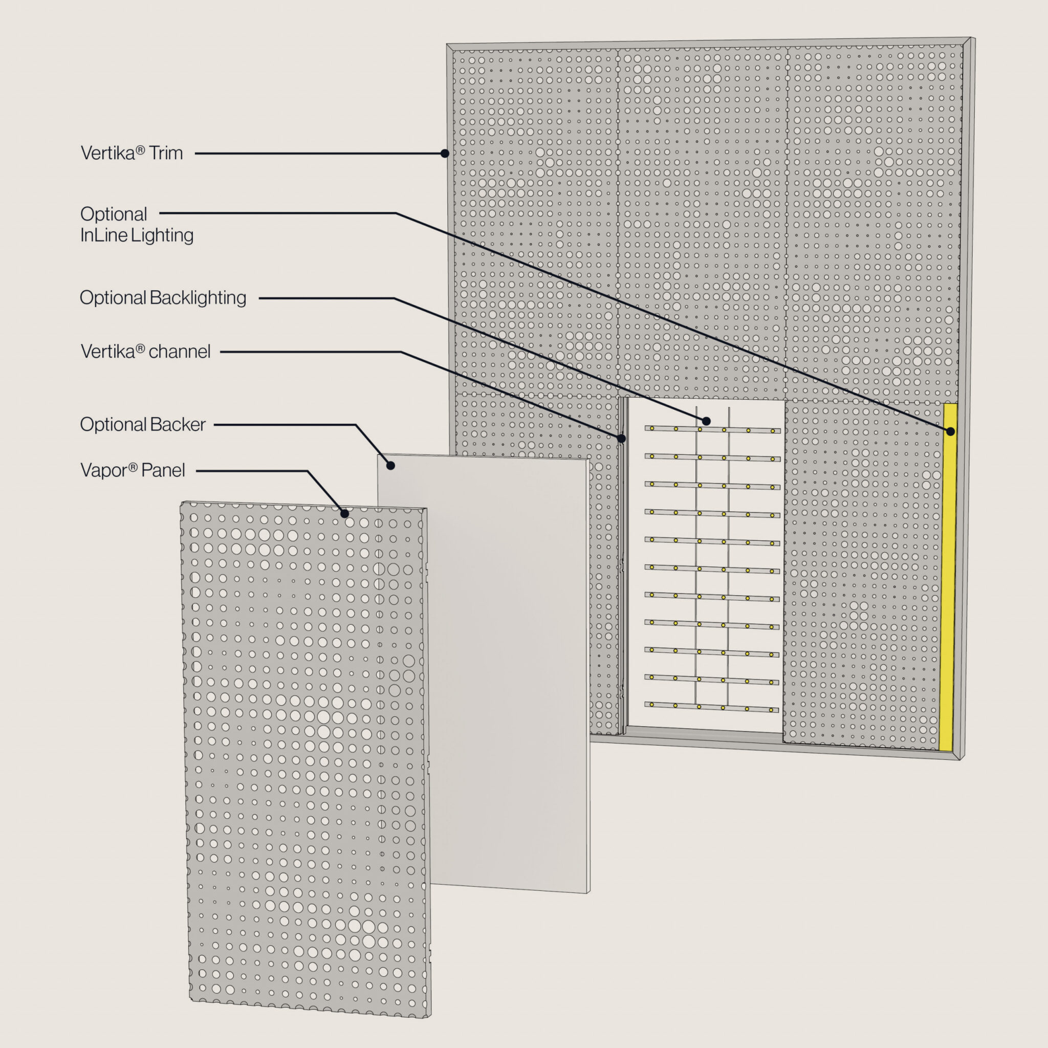 Available in a variety of designs, Vapor® PIXEL not only minimizes noise pollution but also brings your vision to life with options for InLine and Backlighting. Illuminate your surroundings while enjoying the benefits of acoustic comfort, making it the perfect choice for modern interiors that prioritize both form and function.