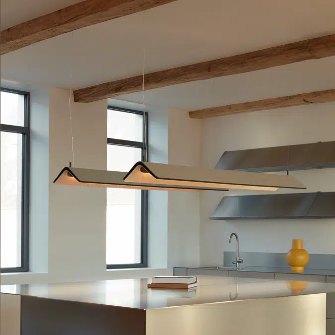Vika, a sculptural lighting solution created in collaboration with Soyuta and designer Khodi Feiz, provides atmospheric light while managing acoustics. It creates a peaceful and serene atmosphere.