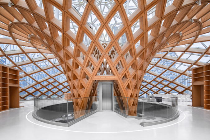 Tasarımın odak noktasında yer alan lamine ahşap kafes kabuk sistem, doğadan ilham alan güçlü bir metafor üzerinden şekilleniyor. İlhamını görkemli Sekoya ağacı kavramından alan bu yapı, zemindeki merkezi noktadan yükselerek cam giydirme cephenin tepe noktasına yaklaştıkça dışa doğru genişliyor. Bu hareket, hem strüktürel hem de görsel olarak etkileyici bir “elma çekirdeği” silüeti oluşturuyor. Ahşap kafesin ritmik ve tekrarlayan geometrisi, nanoteknolojinin düzenli, katmanlı ve hassas yapısına doğrudan bir gönderme niteliği taşıyor.