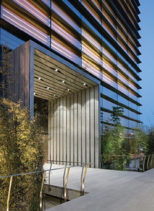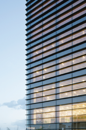 Tower’ın yenilikçi giydirme sistemi, yıl boyunca operasyonel verimliliği en üst düzeye çıkarmak için değişken kesitli yatay dış cephe kayıtlarını kullanmaktadır. Cephenin ince bükülmüş profilleri kuleyi sardıkça yön değiştirerek ve izleyicinin bakış açısına bağlı olarak değişen bir doku oluşturuyor. Yapının perde duvarına entegre iç ahşap örtücüler kullanıcılara çalışma alanlarında bireysel gün ışığı kontrolü sağlar. Sonuç, ofis ihtiyaçlarını yerine getiren, yapının şehrin yeni ve genişleyen bir bölgesine ilham veren ve mimari etkisini arttıran ve aynı zamanda çevreye duyarlı, kinetik bircephe sistemidir. Gün boyunca ve binanın etrafında hareket ederken, bu yenilikçi duvar düzeneği, gözlemciyi içine çeken ve merak uyandıran dönüştürücü bir etki yaratır. Heykelsi dış cephe kayıtları, güneşin durumuna ve yayanın bakış açısına bağlı olarak farklı desenler oluşturuyor. Ahşap panjurlar kullanıcıların ihtiyaçlara göre açılıp kapandıkça, kulenin kendisi geçirgen veya yansıtıcı görünür, içinde kullanım ve aktivitelerin dağılımını ortaya çıkarır.