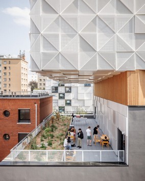 Bu tasarım kararı, mimaride “tutumluluk” (frugality) kavramının güçlü bir yorumu olarak öne çıkıyor: Mevcut olanı tüketmeden, minimum müdahaleyle maksimum mekânsal değer üretmek. Projenin mühendislik açısından en çarpıcı unsuru ise, dikey sirkülasyon kuleleri ve 42 metrelik tek parça dev bir kiriş tarafından taşınan, havada asılı duran “köprü-bina” formu. Bu cesur strüktürel hamle sayesinde üçüncü kat tamamen kolonlardan arındırılarak, Paris siluetine yukarıdan bakan geniş bir kamusal terasa, adeta kentsel bir balkona dönüştürülüyor. Eğitim mekânı burada yalnızca kapalı hacimlerle sınırlı kalmıyor; kentle doğrudan görsel ve mekânsal ilişki kuran bir deneyim alanına evriliyor.