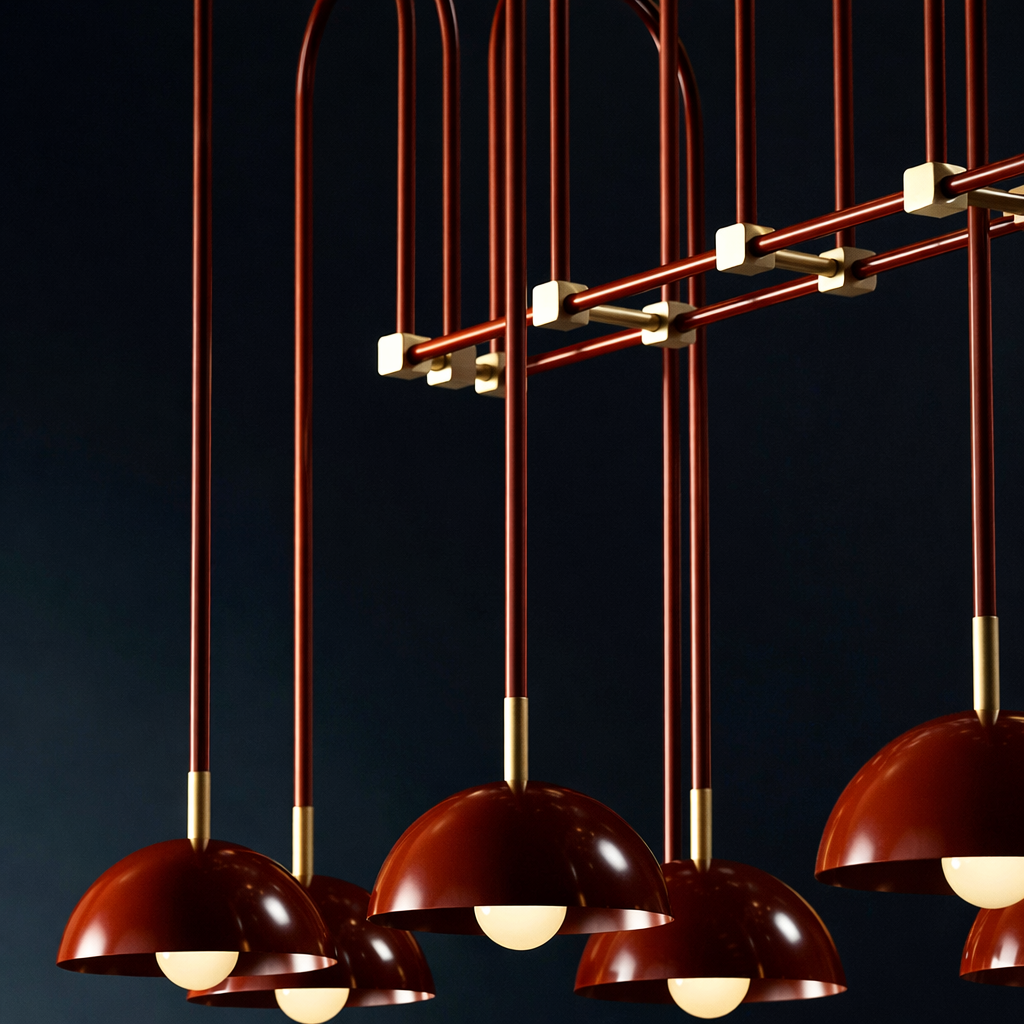 Arcelle, çoklu sarkıt başlıklarının yatay bir taşıyıcı sistem üzerinde bir araya geldiği, modüler ve güçlü bir aydınlatma çözümüdür. Kavisli metal borular ve yarım küre formundaki başlıklar, tasarıma hem hareket hem de denge kazandırır.