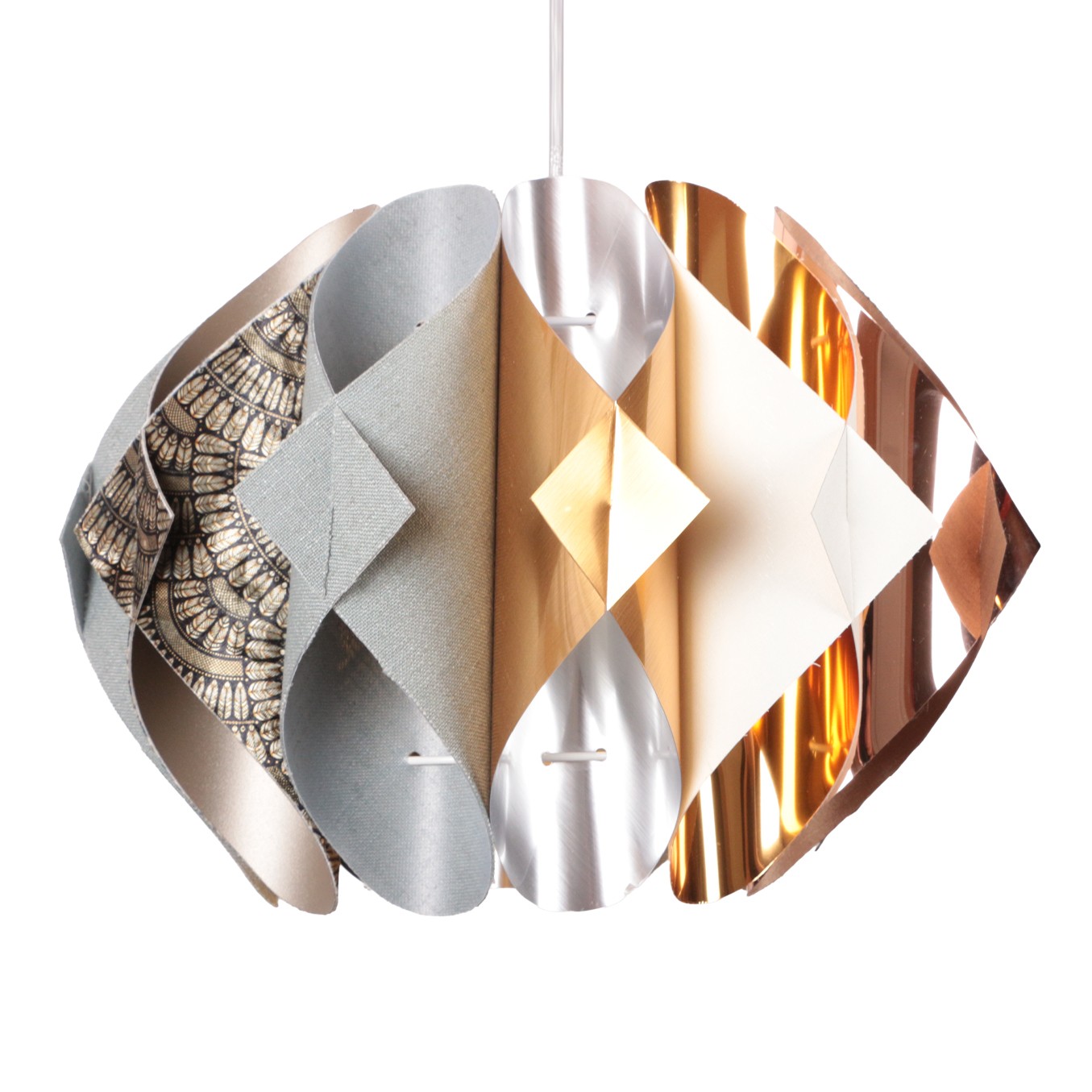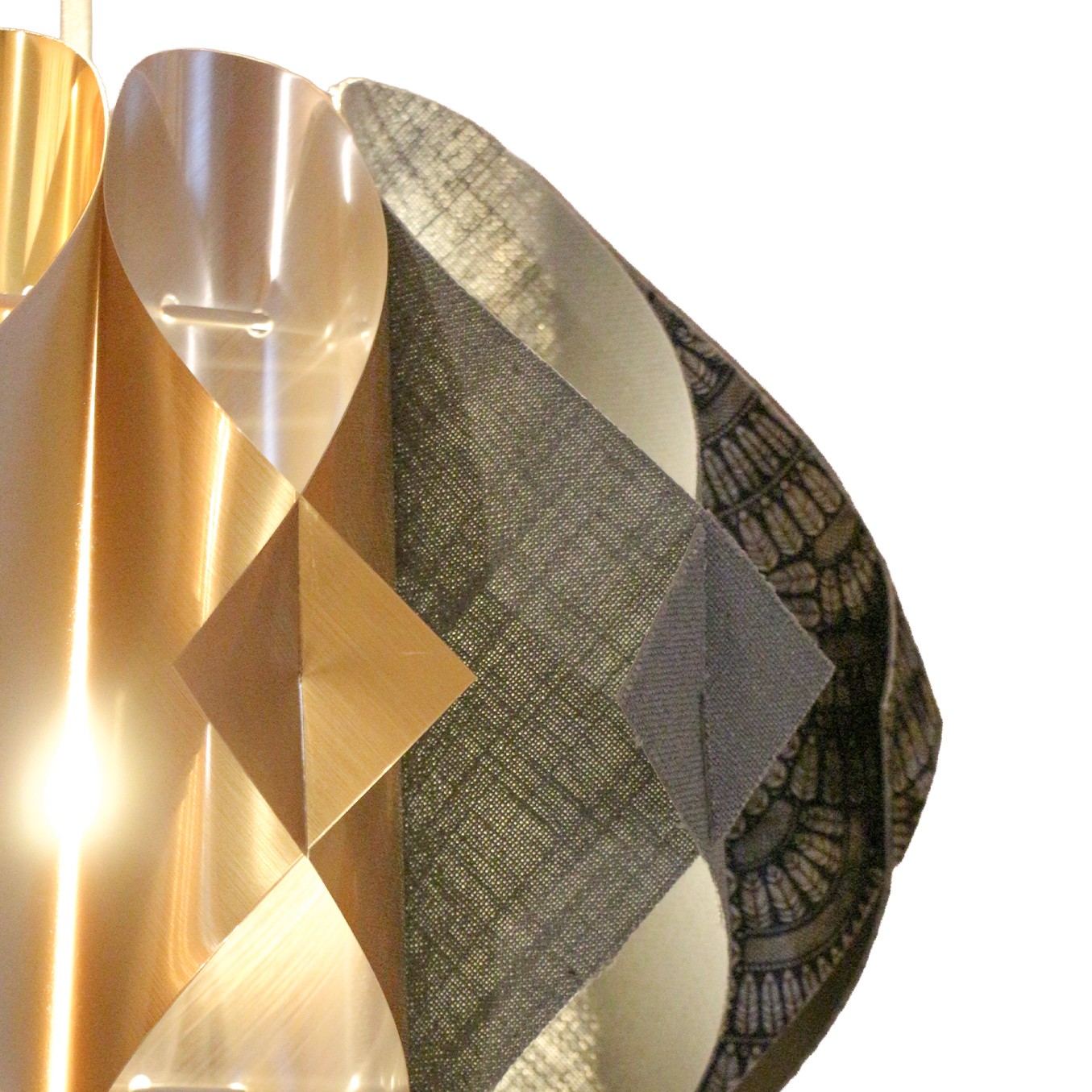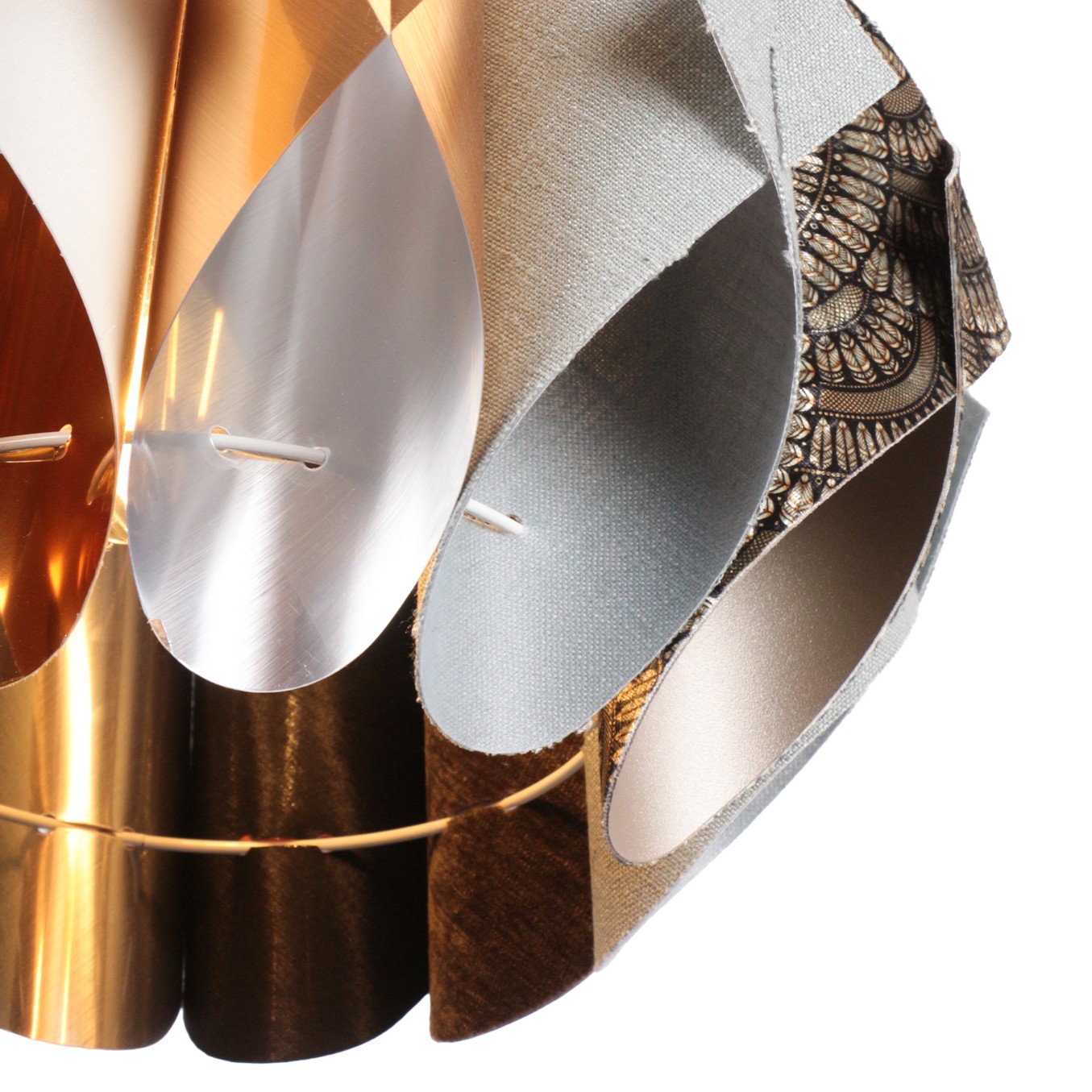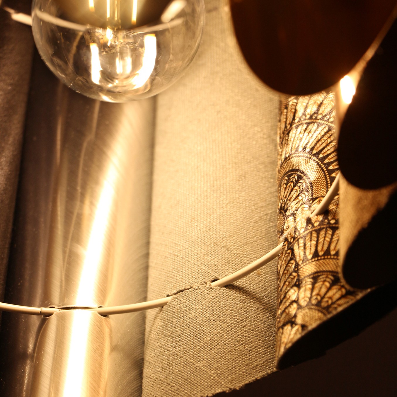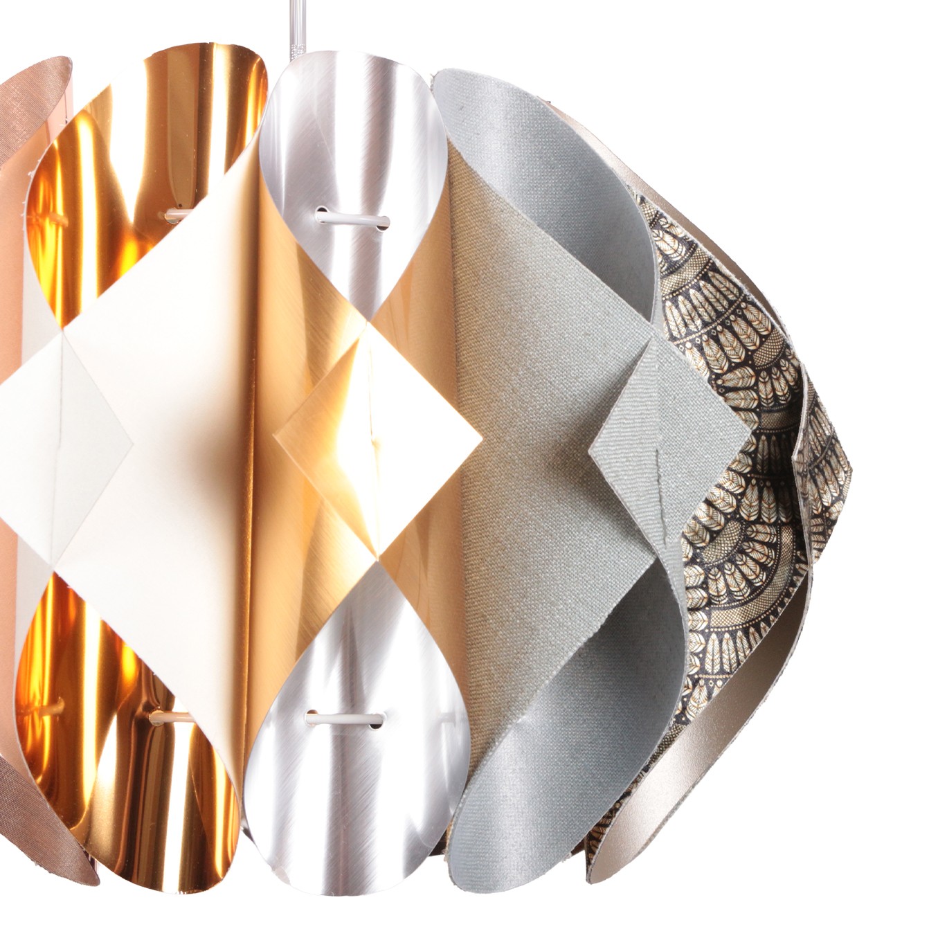 Lyra Çok Katmanlı Desenli Sarkıt Avize, altın-gümüş metalik katmanları, etnik desenli kumaş detayları ve çok katmanlı geometrik formuyla mekanınıza hem zengin bir estetik hem de büyüleyici bir ışık oyunu kazandırır. Ürünün iç ve dış katmanlarındaki geometrik parçaların yönlerini tercihlerinize göre özelleştirilebilir ve farklı görünümler elde edebilirsiniz.
