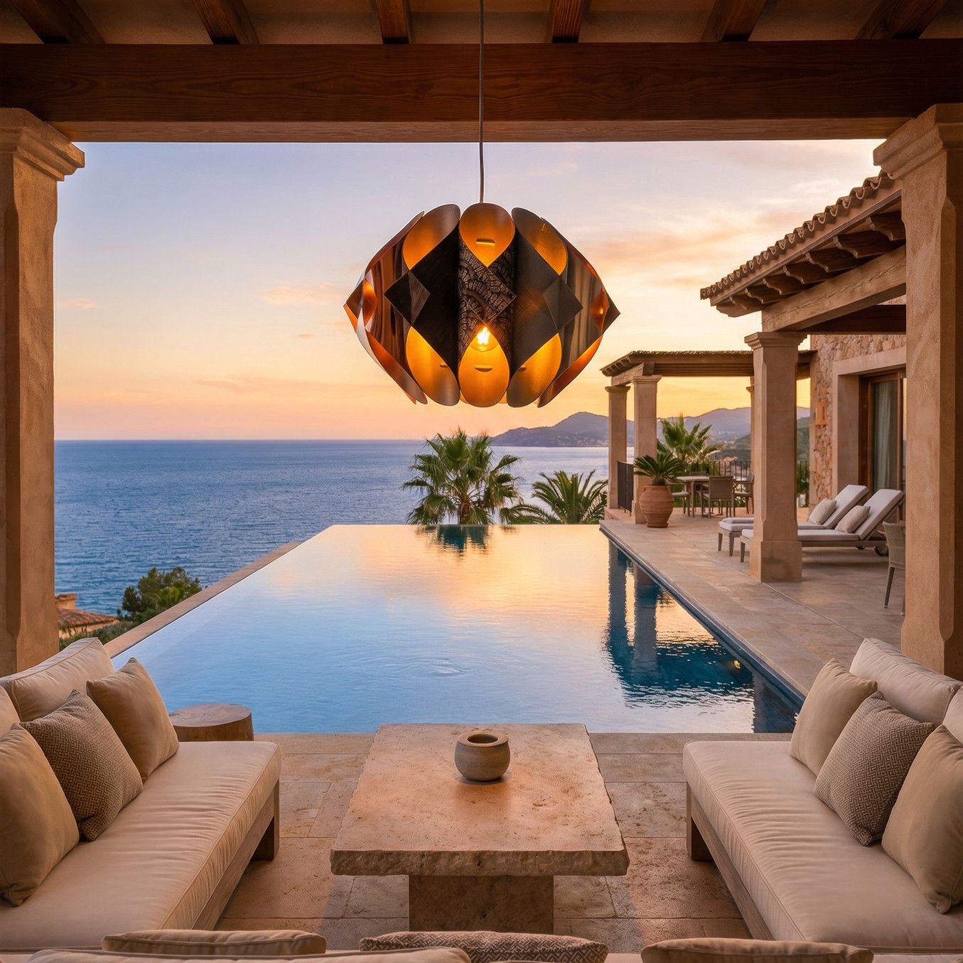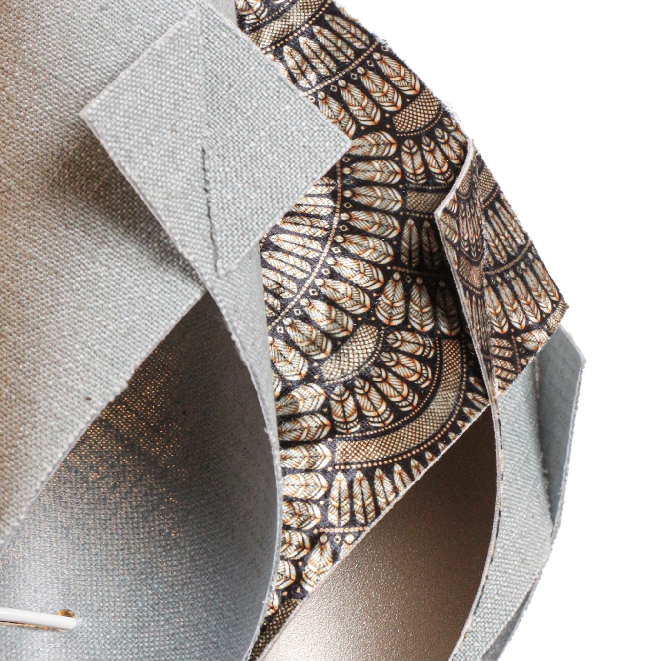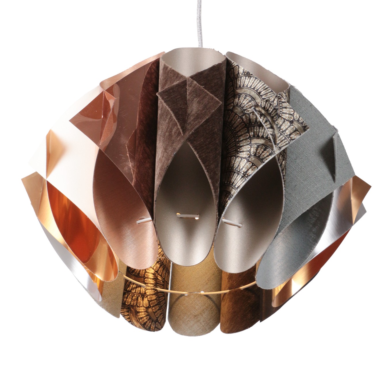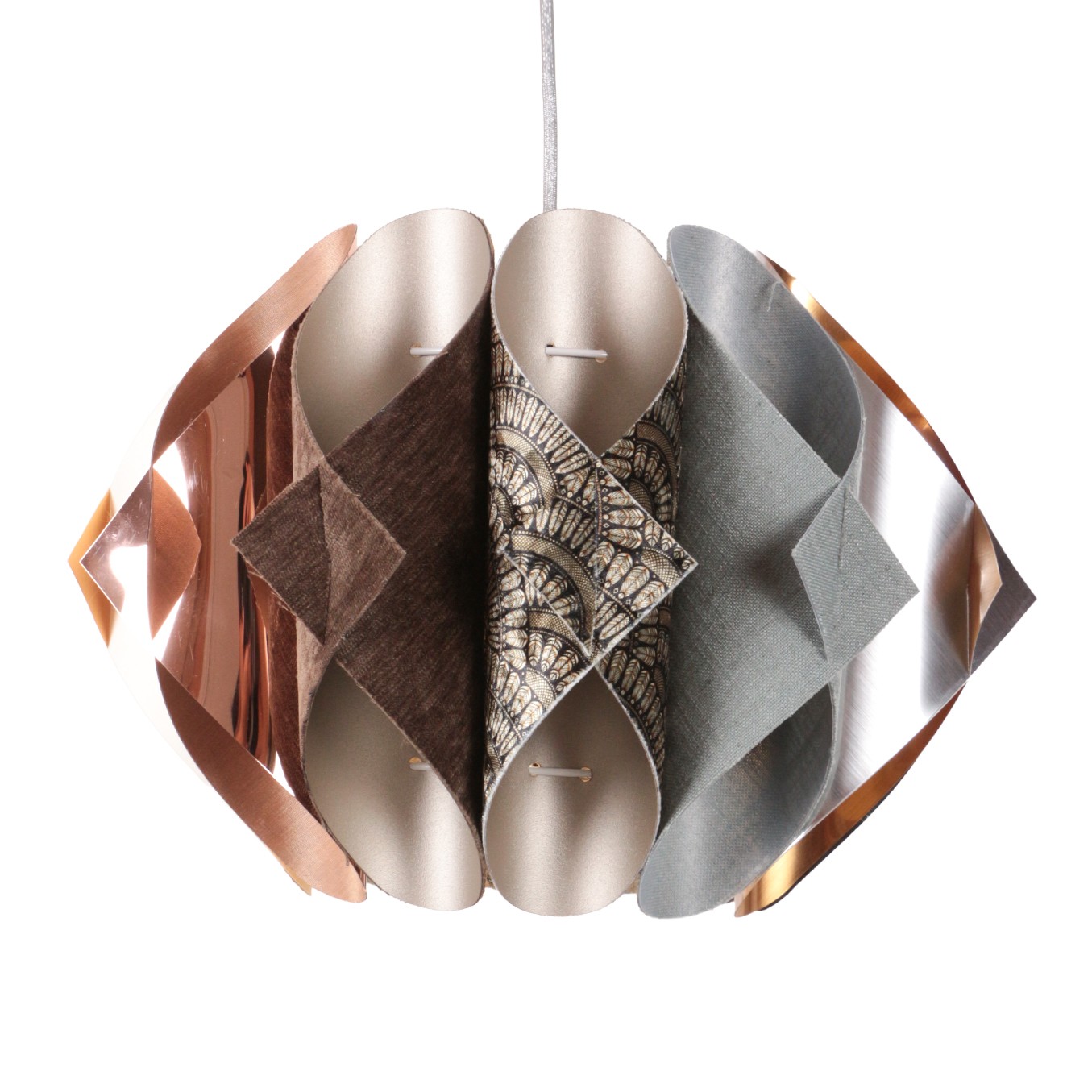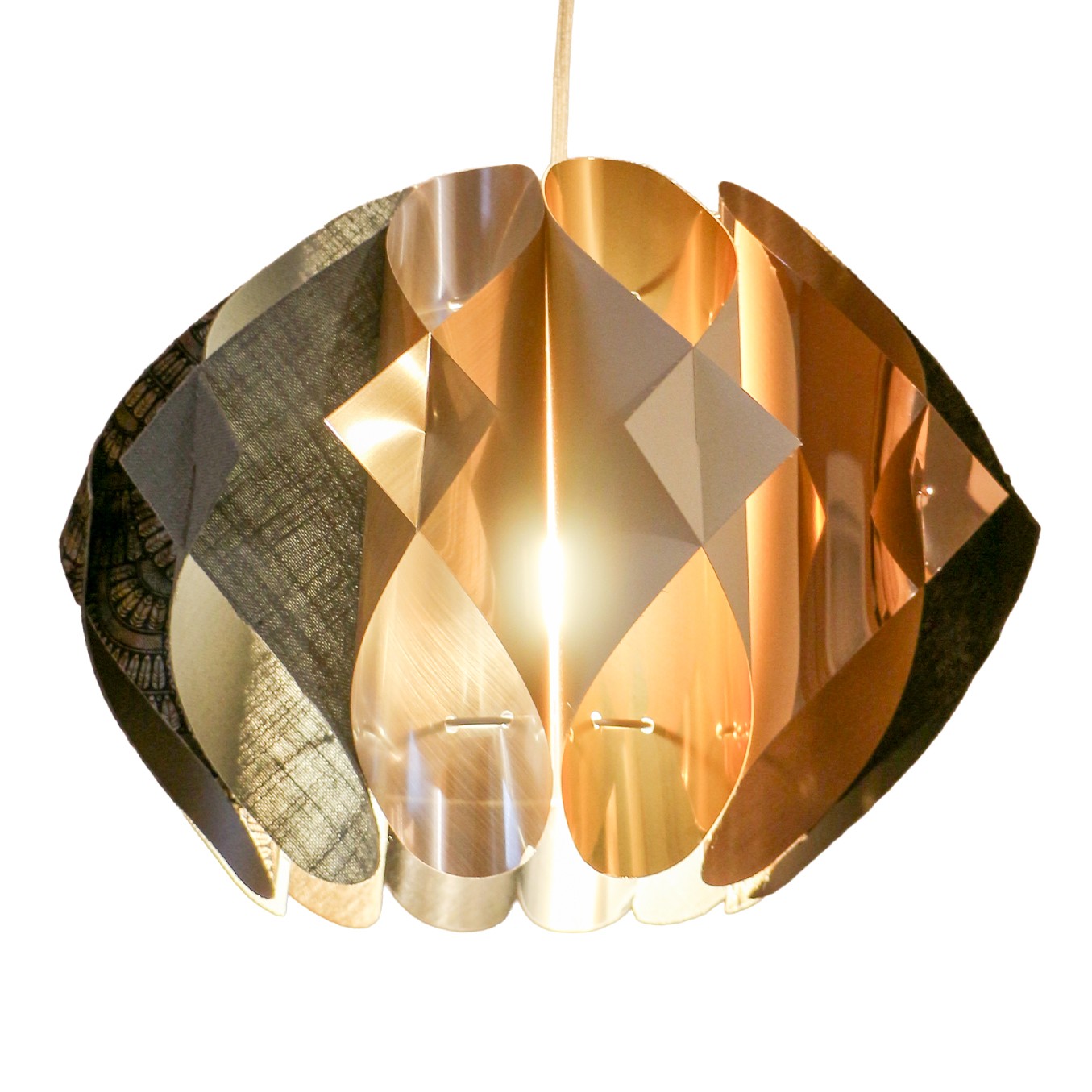 Lyra Çok Katmanlı Desenli Sarkıt Avize, altın-gümüş metalik katmanları, etnik desenli kumaş detayları ve çok katmanlı geometrik formuyla mekanınıza hem zengin bir estetik hem de büyüleyici bir ışık oyunu kazandırır. Ürünün iç ve dış katmanlarındaki geometrik parçaların yönlerini tercihlerinize göre özelleştirilebilir ve farklı görünümler elde edebilirsiniz.