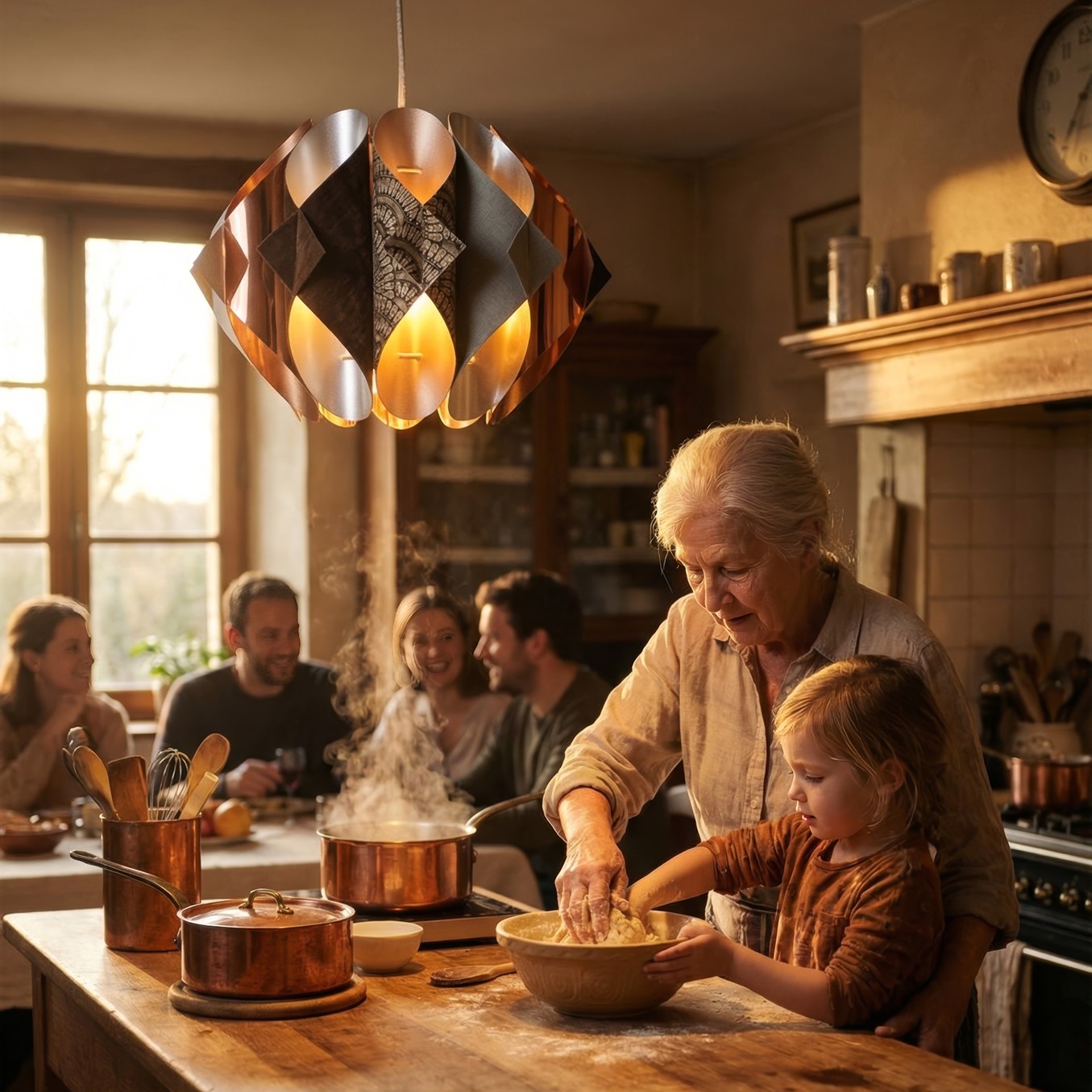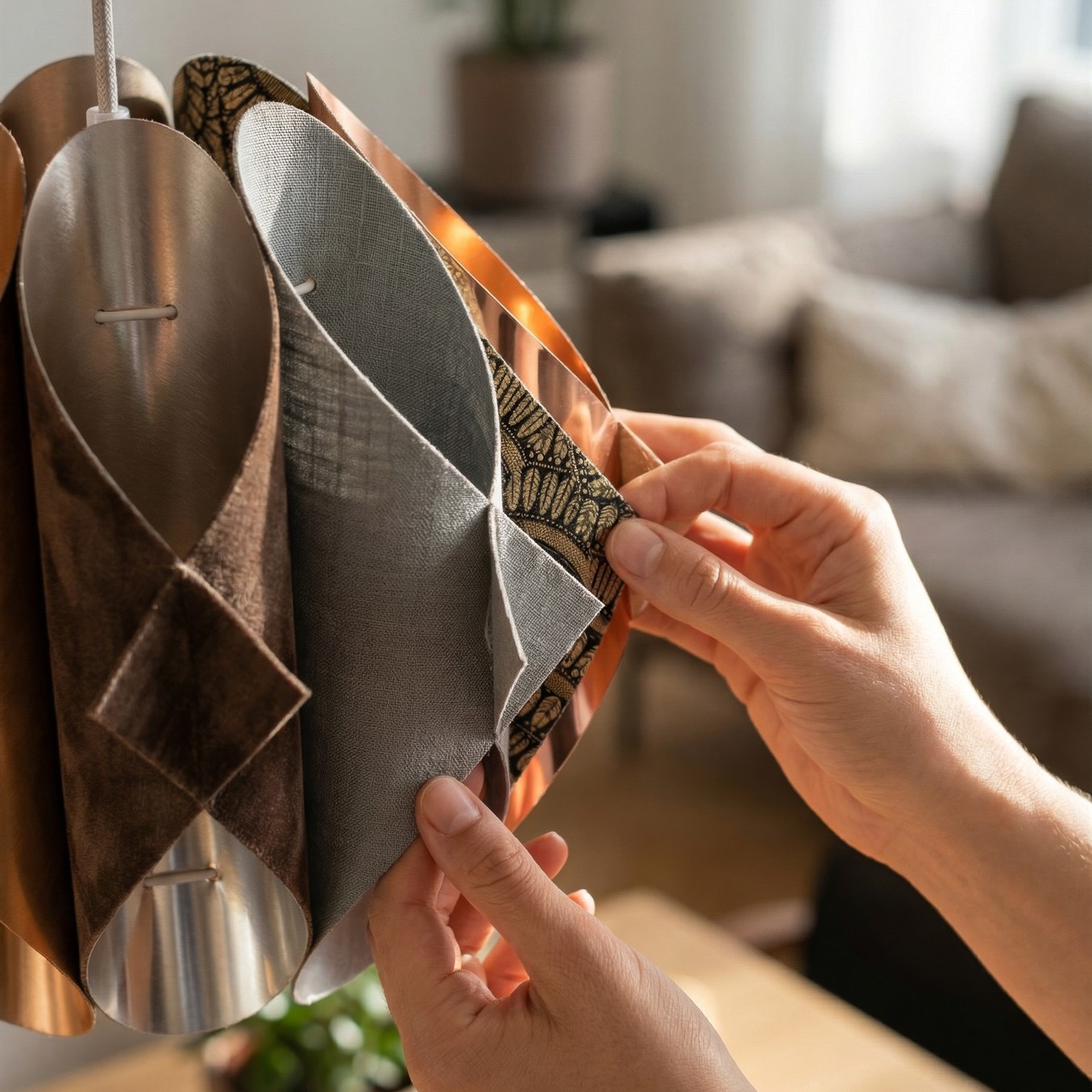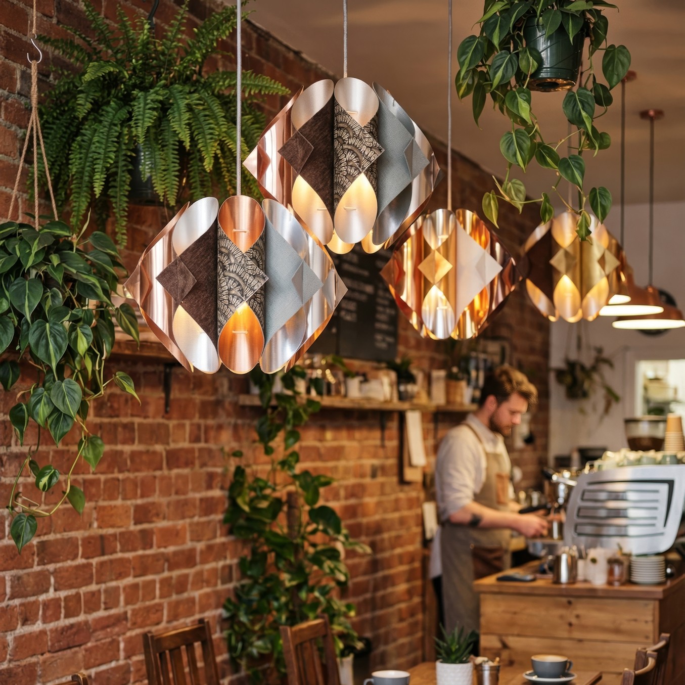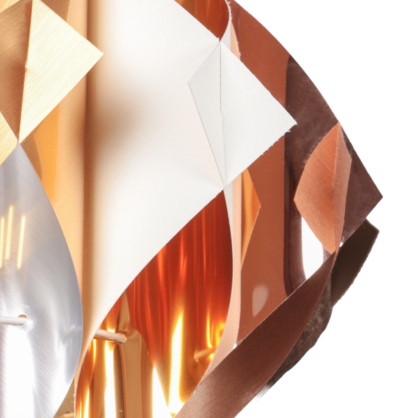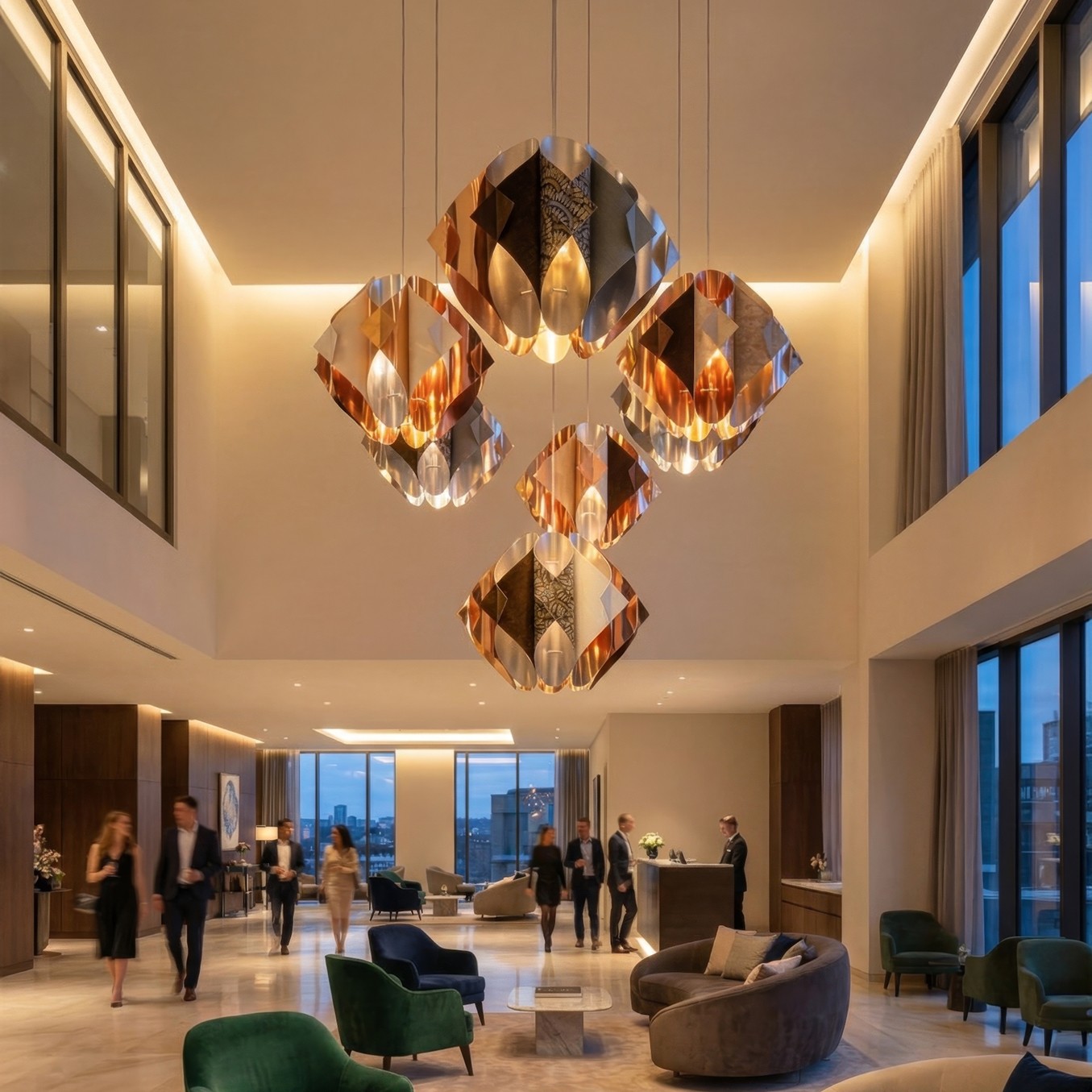 Lyra Çok Katmanlı Desenli Sarkıt Avize, altın-gümüş metalik katmanları, etnik desenli kumaş detayları ve çok katmanlı geometrik formuyla mekanınıza hem zengin bir estetik hem de büyüleyici bir ışık oyunu kazandırır. Ürünün iç ve dış katmanlarındaki geometrik parçaların yönlerini tercihlerinize göre özelleştirilebilir ve farklı görünümler elde edebilirsiniz.