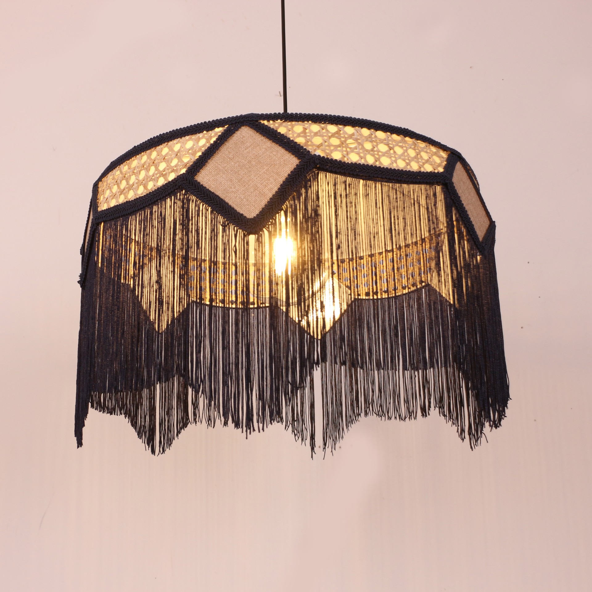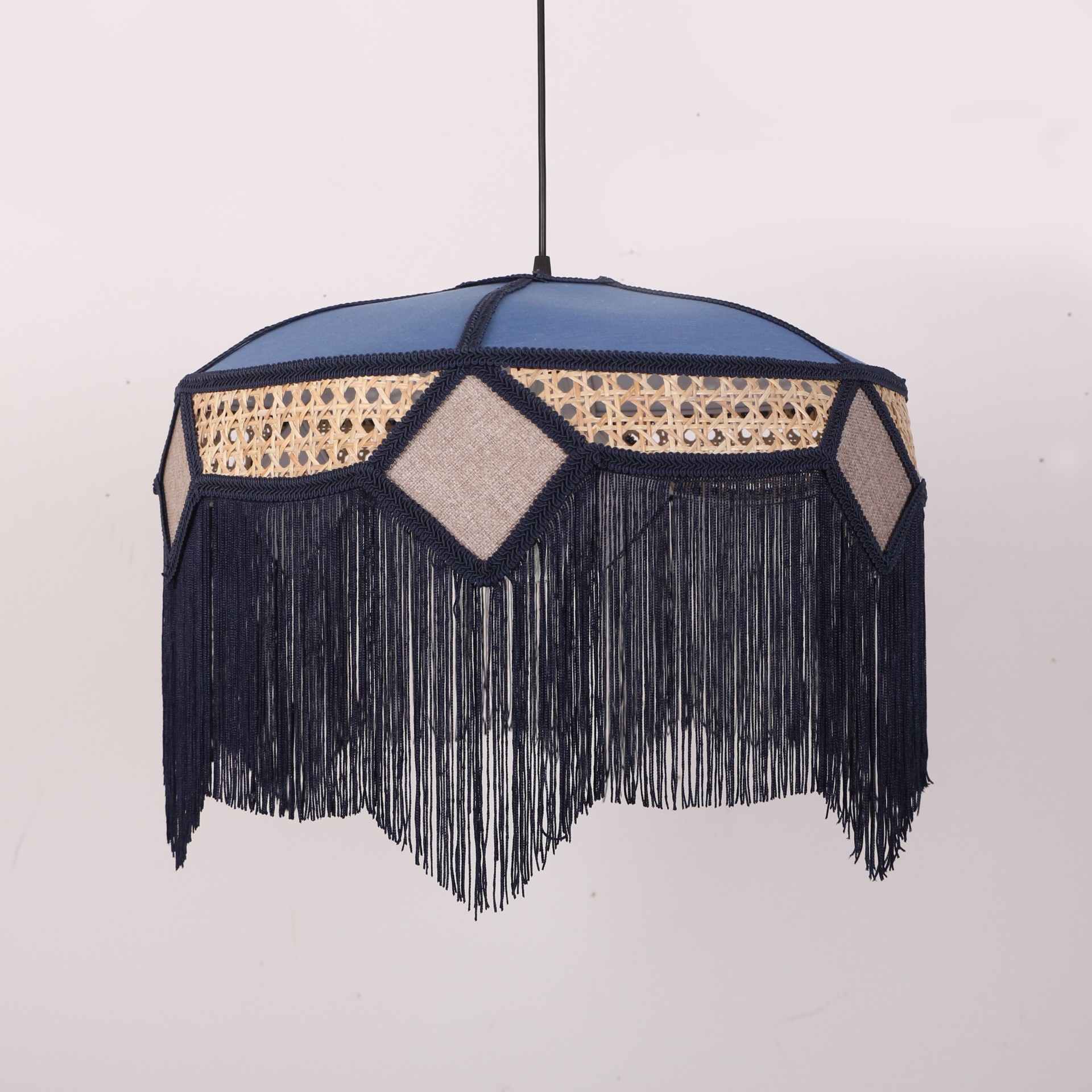 İmalat Ürünümüz; Işık geçirgenliğiolan abajur kumaşı ve doğal hazeran kullanılarak, statik boyalı tel üzerine el işçiliği ile üretilmiştir. İmalat ürünümüzde, bütün detaylar düşünülerek saçak, kadife biyeler, sutaşı ve özel ipler kullanılmıştır.