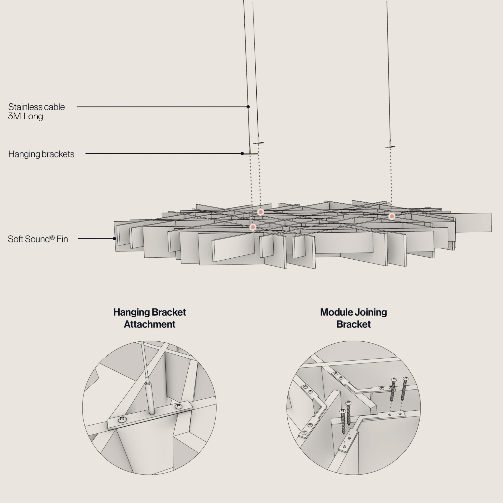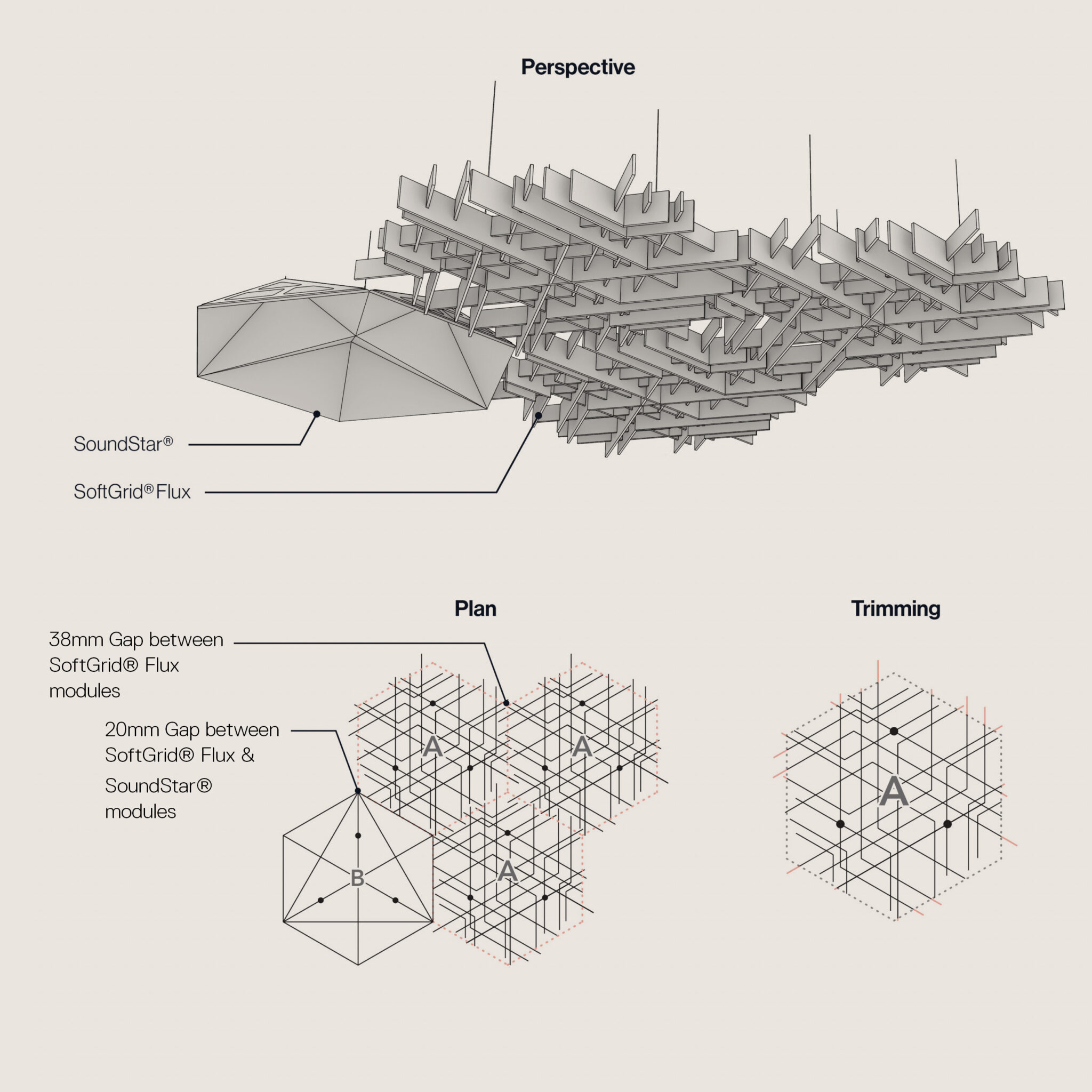 Bu mevcut sistem, modüllerin istenilen şekilde bir araya getirilmesine olanak tanır, böylece tamamlayıcı bir akustik konfor elde edilir veya daha belirgin bir tasarım için ayrı ayrı kullanılabilir. 'SoftGrid® FLUX', yaratıcı projelerinizi desteklerken estetik bir dokunuş da sunar.