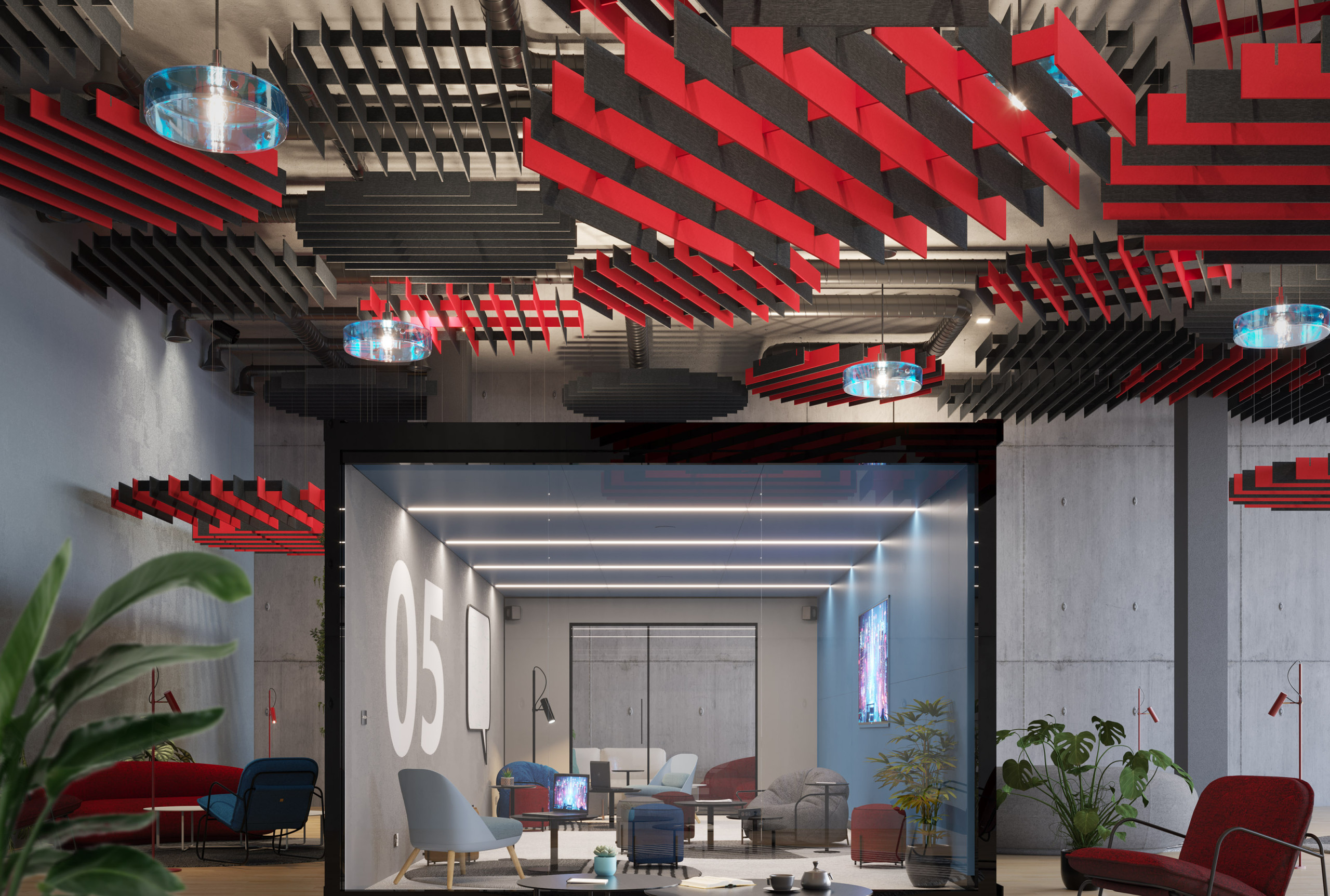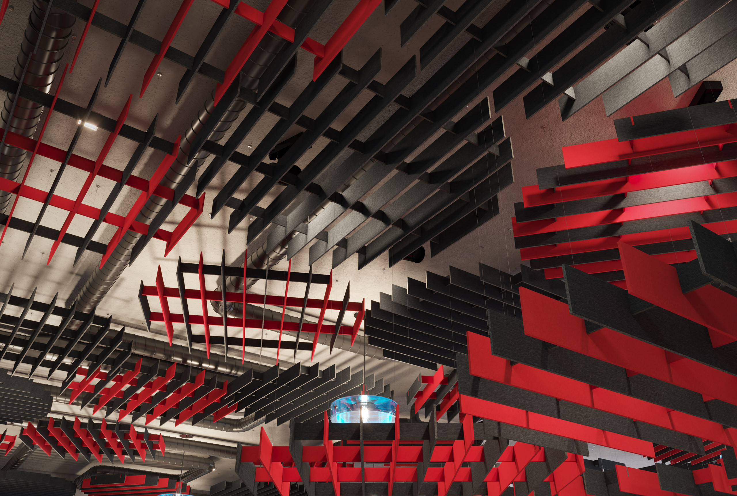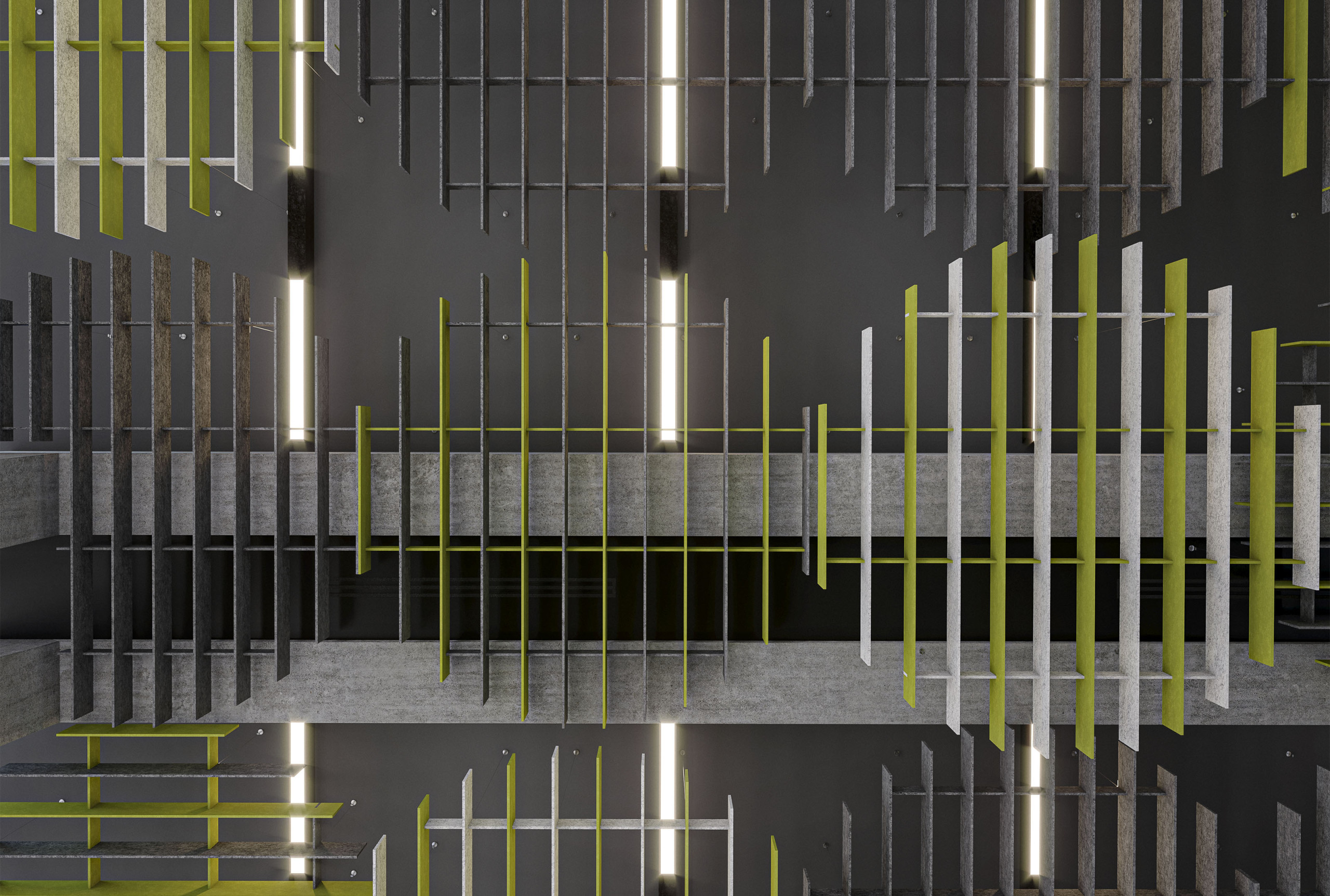 NOWN 'SoftGrid® ROUND', akustik tavan modülleri, farklı uzunluklarda yerleştirilmiş panellerle dairesel bir şekil oluşturarak hem etkileyici bir yapısal tasarım sunar hem de Asoft™ malzemesi sayesinde akustik destek sağlar. Round'un baffle'ları, tavanın tamamını kapsayacak şekilde birbirine bağlanabilen sürekli bir halka serisi oluşturur veya belirli bir alana odaklanarak akustik desteği artırmak için kullanılabilir.