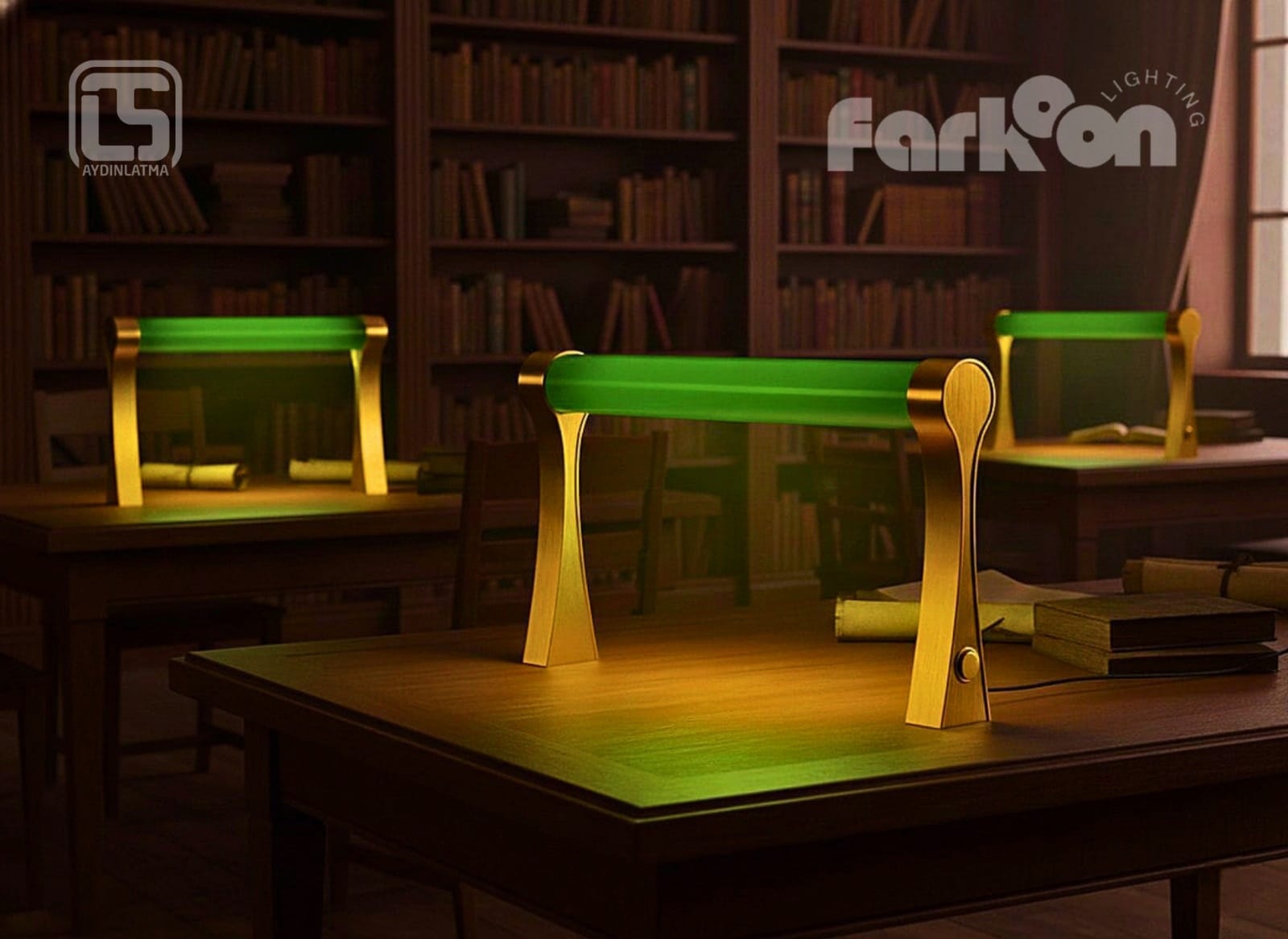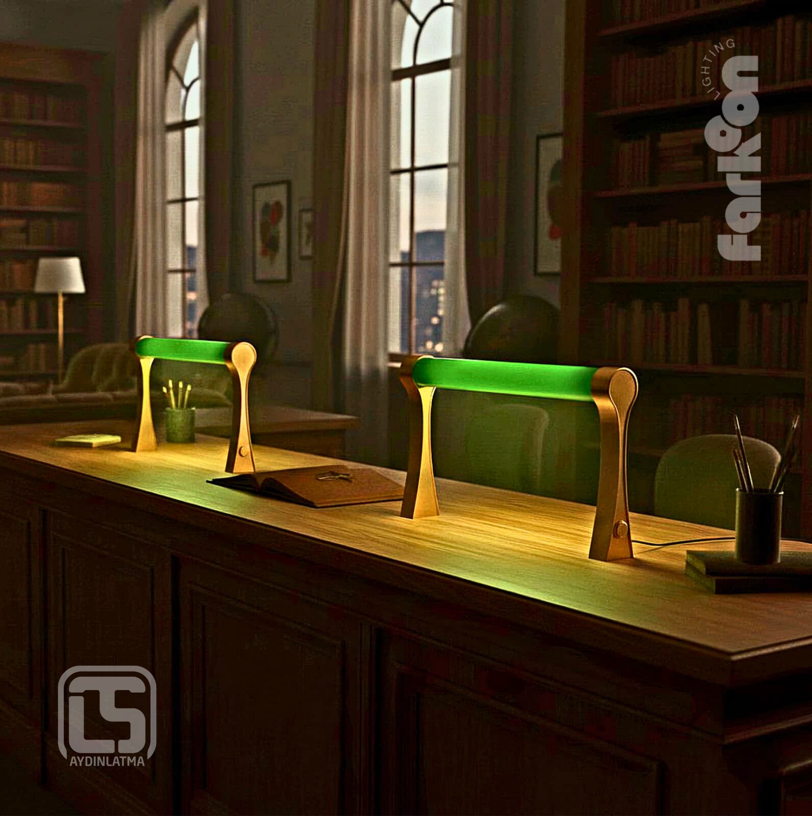 Metal ayakları ve cam ışık gövdesi, klasik kütüphane estetiğini modern bir yorumla buluşturur. Çalışma odaları, ofisler, okuma köşeleri ve akademik mekânlar için ideal bir çözümdür.