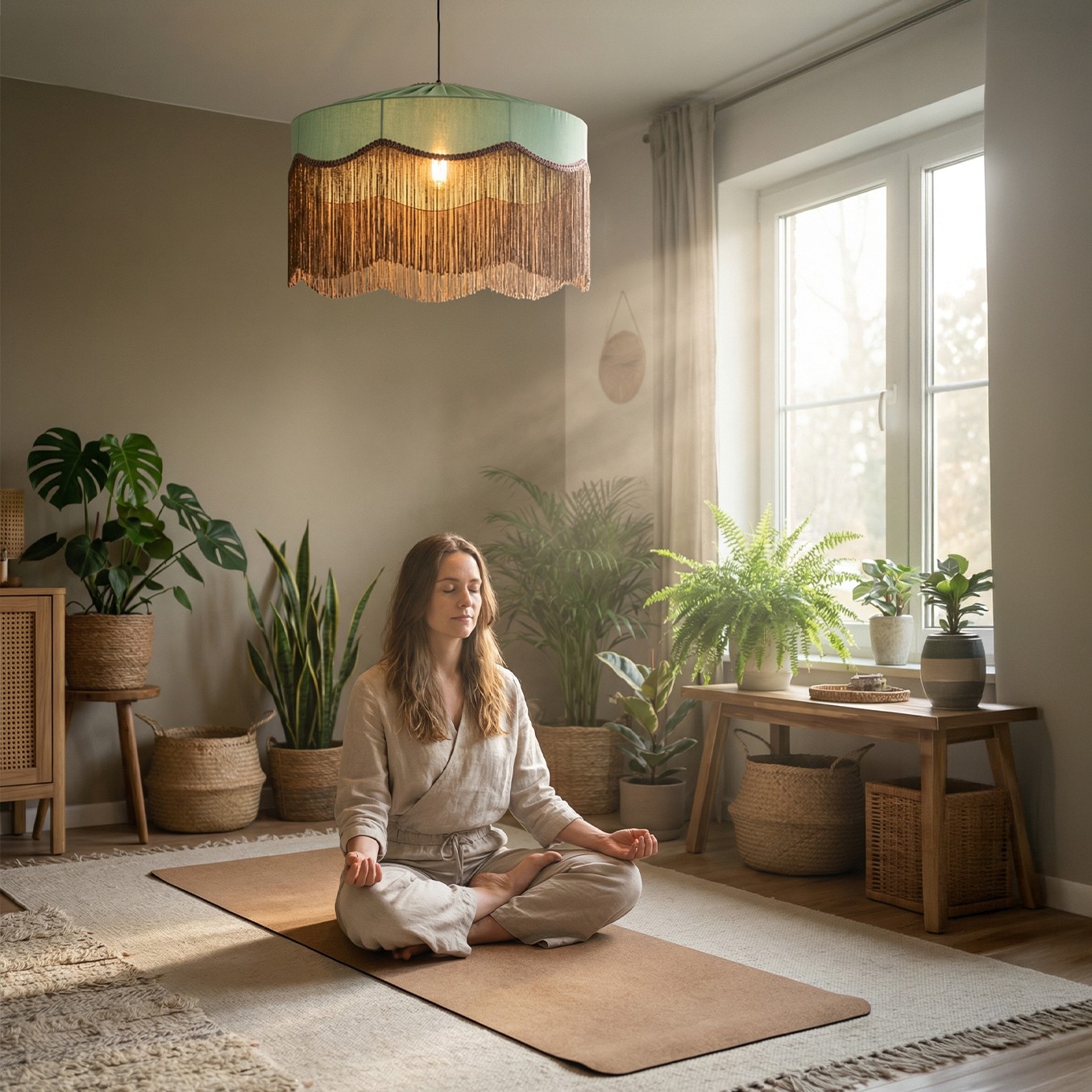 Zarafet Mint Yeşili Püsküllü El İşçiliği Kumaş Avize, el işçiliğiyle hazırlanmış mint yeşili kumaş, kahverengi ve altın rengi karışık püskül detayları ve vintage estetiğiyle mekanınıza hem klasik bir zarafet hem de taze bir atmosfer kazandırır.