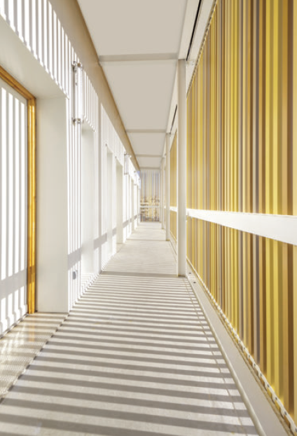 Cross-laminated wooden panels give the space a subtle scent reminiscent of a forest. The use of Cross-Laminated Timber (CLT) helps limit energy consumption and reduces the building’s carbon footprint. The façade combines perforated and slanted panels with large aluminum shingles to break down the building’s scale and volumes. The perforated shell passes in front of some of the wide glass bands, turning the building into a luminous sculpture in the Marseille night. Light filters through the perforations in the protective shell or through the gaps in the aluminum railings above the shared spaces, while the openings in the rooms can be completely closed with shutters.