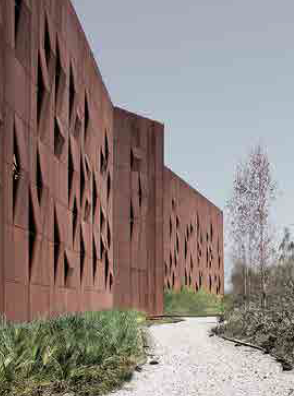 At first glance, the structure does not reference any particular form. This mass, resembling almost ‘nothing,’ creates a sense of neutrality that gradually shifts toward the industrial spirit of the city as one approaches. Instead of glossy and assertive materials, the façade is clad with perforated panels made of weathering steel (Corten A), whose rusted surfaces reinforce this impression. Although not previously used in such a building, this texture is familiar to the city’s inhabitants from industrial environments, allowing them to easily recognize and relate to it. The building thus sheds its ‘newness’ and sense of unfamiliarity, taking an important step toward becoming integrated with the city and its people.