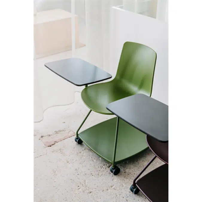 Tray chair combines a shell on a structure with castors, a tray and a folding writing table, so it is so useful for responding to the requirements of learning and multi-purpose spaces. The shell has a broad range of finishes available: wooden shell, polypropylene shell with or without polypropylene or upholstered seat pad, or fully upholstered one. Furthermore, the backrest and the writing table can be produced in two dimensions.