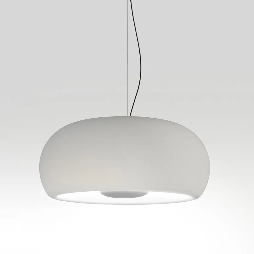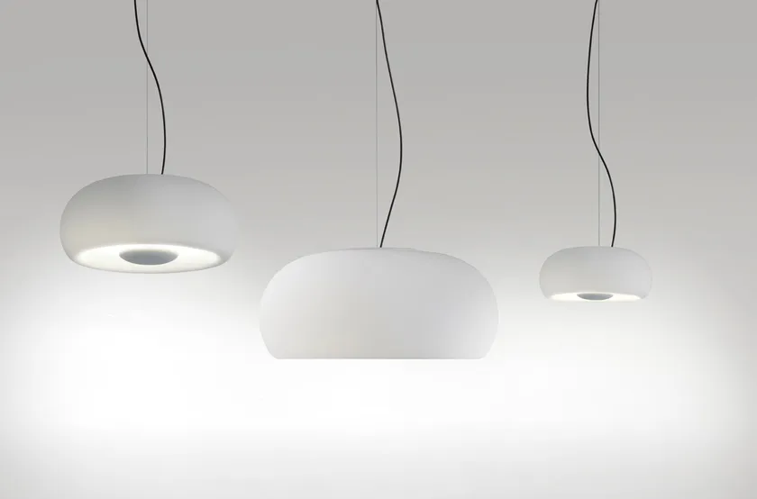 At first glance, Vetra could be no more than a traditional, old-fashioned, blown-glass lamp, but turning it on yields a surprise.‎ Joan Gaspar uses a completely closed glass diffuser as a reflector, and creatively places the light source outside -instead of inside- the shade.‎ The Vetra gives off more light than one would expect, without glare.‎ Much of the light is directed downward, and the rest is filtered toward the inside of the shade, subtly illuminating it.‎ Like an echo multiplying the light, when it’s on, its entire outline is drawn out and seems to come alive.‎ This collection is offered in different diameters (20, 32 and 43 cm) in white and amber, a color that emphasizes even more its relationship with the light.‎ A contrasting layout in which the lamp proper becomes more visible and its light – sheltered by these tones – warmer.‎